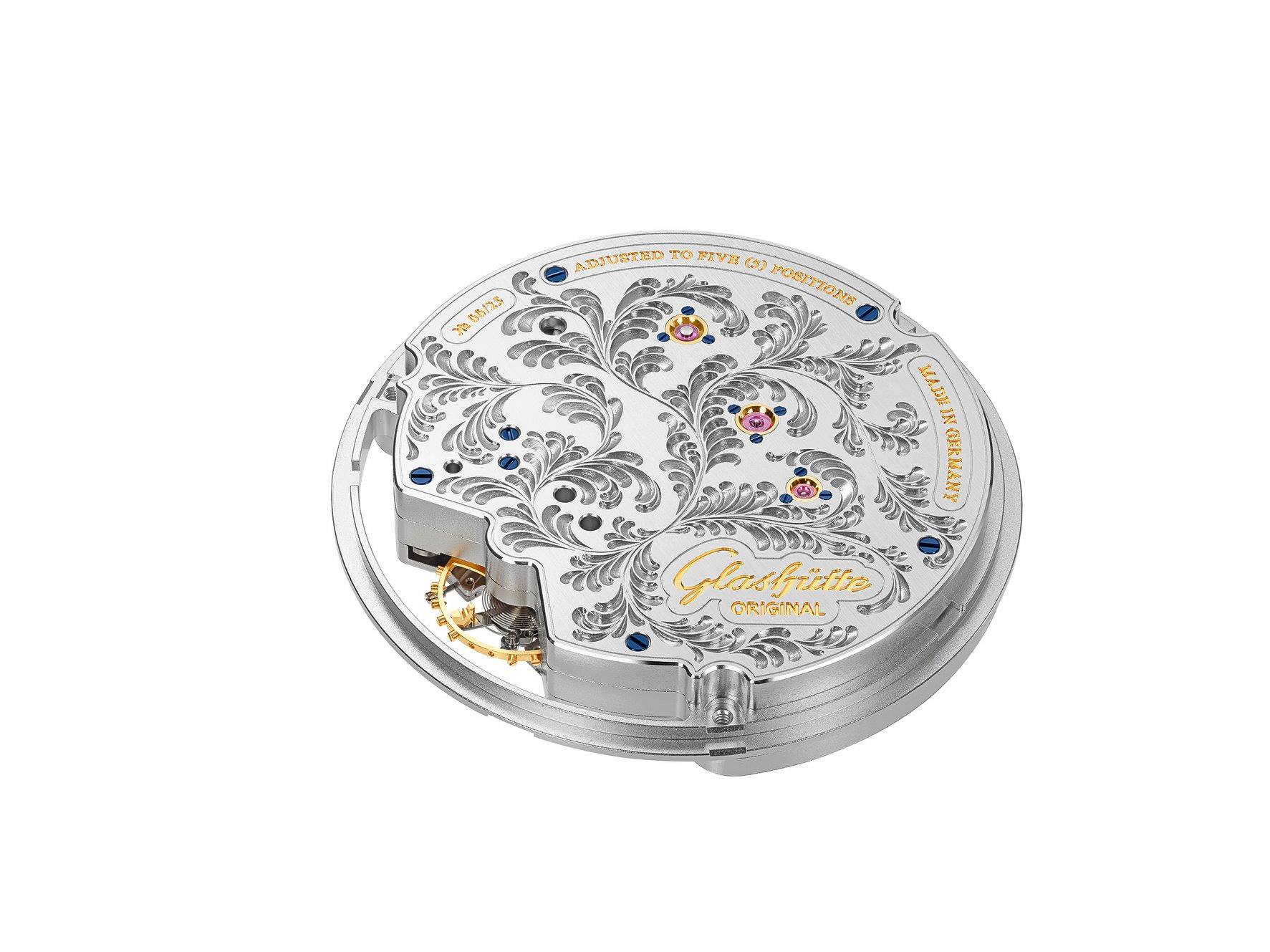 Las funciones se accionan gracias al movimiento de cuerda manual Calibre 58-01, con un acabado muy elaborado. Entre sus características se encuentra un refinado mecanismo de parada del segundero: cuando se extrae la corona, la indicación de la hora se detiene y el segundero se pone a cero y permanece en dicha posición; Al mismo tiempo, la aguja de los minutos avanza hasta el índice de minutos entero más próximo. Cuando la corona se gira para ajustar la hora, la aguja salta al siguiente índice de minuto, garantizando así que se mantenga la relación correcta entre los segundos y los minutos. Un fondo de caja de cristal de zafiro permite apreciar de un vistazo las características clásicas del arte de la relojería de Glashütte: en la representativa platina de tres cuartos, los chatones de oro atornillados y el puente de volante grabado a mano se fusionan la maestría relojera con la artesanía auténtica. Una correa de piel de aligátor de Luisiana de color marrón oscuro con cierres desplegables de oro rojo o hebilla con hebijón completan el elaborado diseño del nuevo cronómetro.