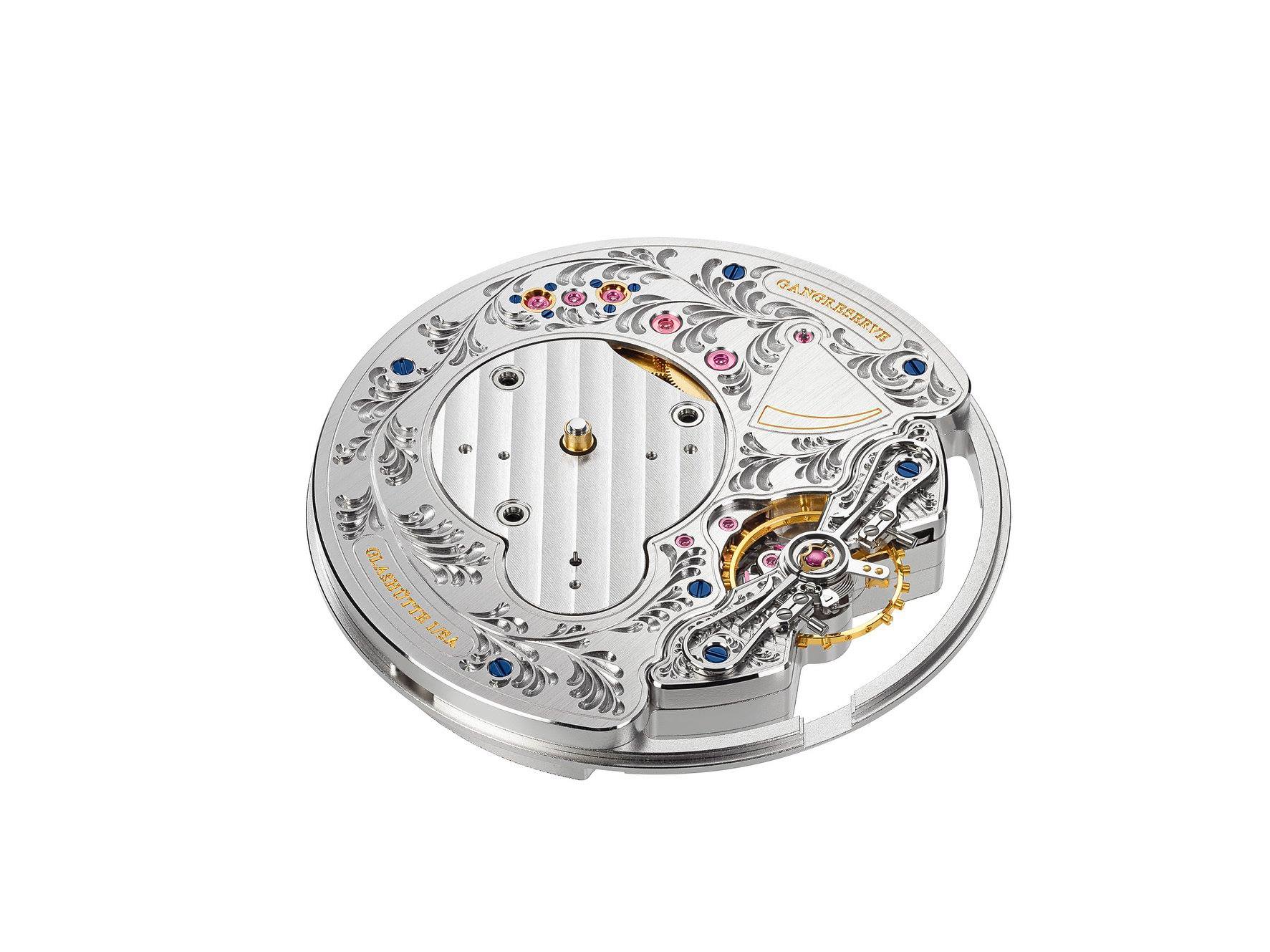 No obstante, la historia de los métodos tradicionales y los elementos de este reloj exclusivo presenta una profundidad aún mayor. La singular cara del reloj queda embellecida por chatones de oro montados sobre tornillos, piedras preciosas de rojo rubí, tornillos azules y grabados dorados. El esqueletizado también se hace patente en una ubicación privilegiada: las agujas de las horas y los minutos, de oro blanco.