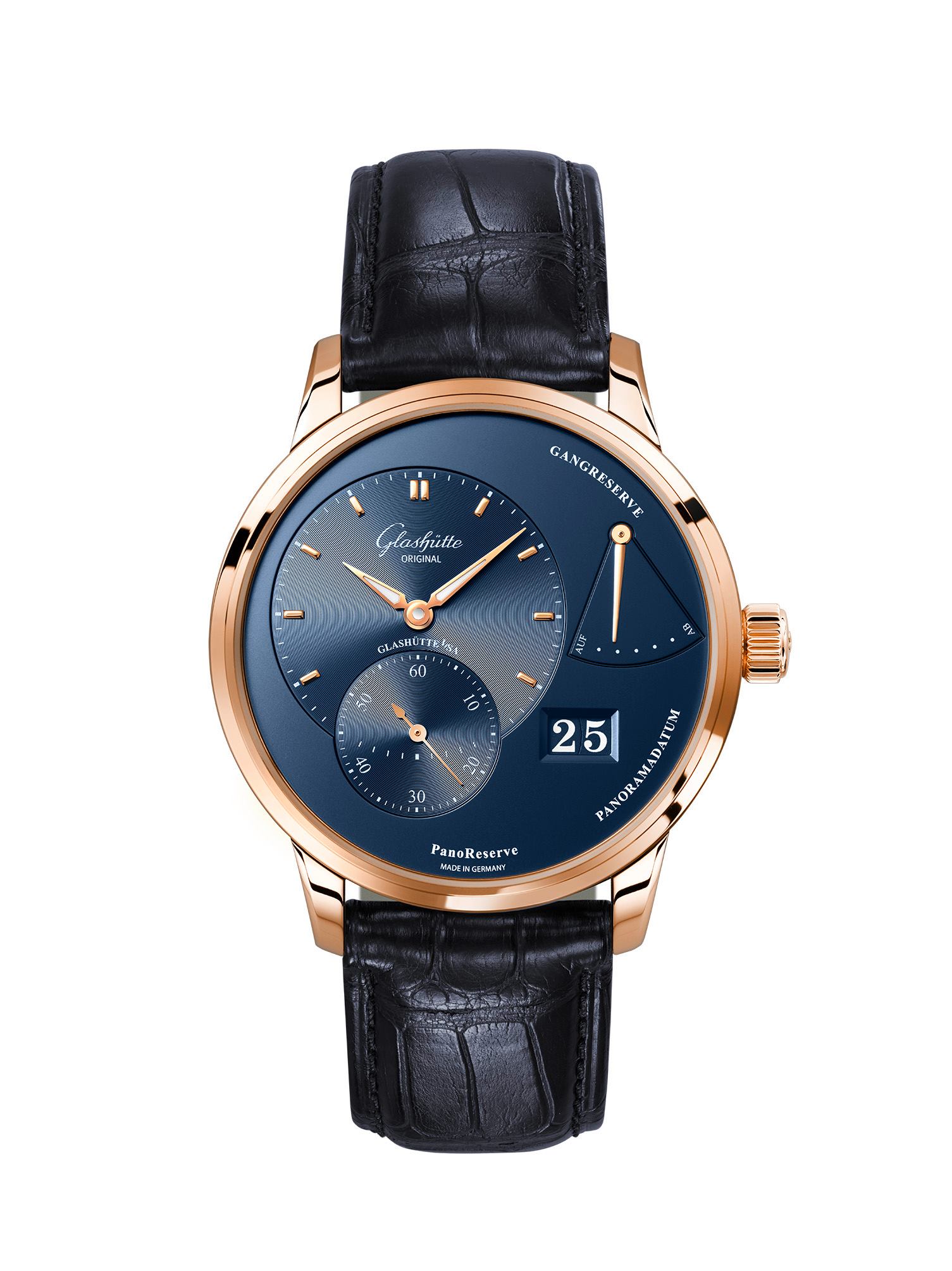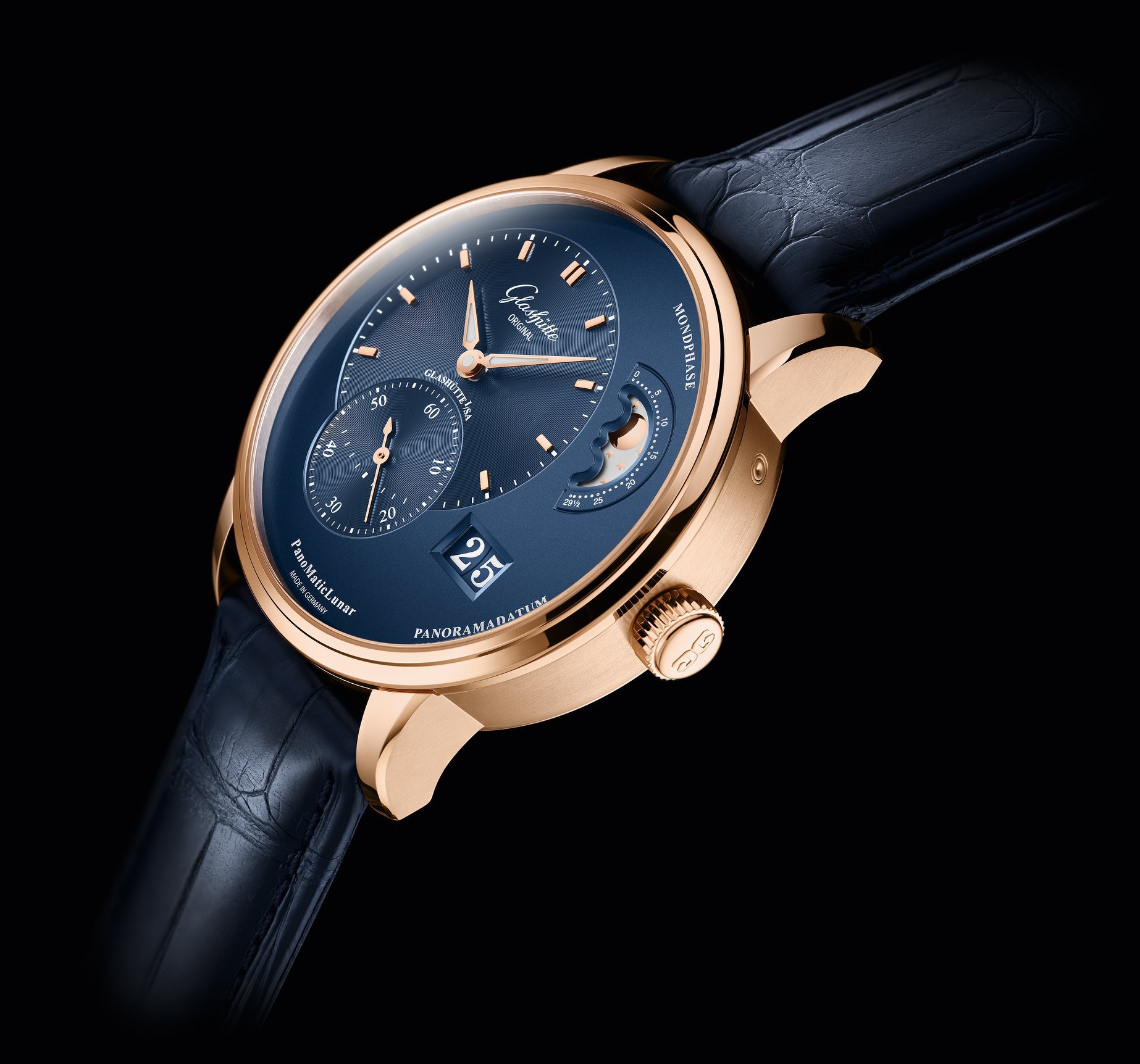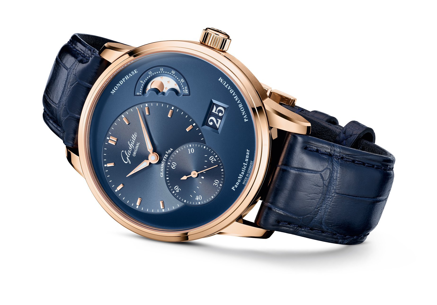 Los nuevos PanoReserve y PanoMaticLunar de la firma de relojería alemana Glashütte Original hacen gala de un diseño contemporáneo a la par que original. La caja de oro rojo con acabado satinado y pulido envuelve las formas asimétricas que caracterizan a ambos modelos. El dial de la horas y los minutos coexiste con la del pequeño segundero, y ambas se disponen en vertical a la izquierda. Su distintiva fecha panorámica, por su parte, se muestra debajo de las 4 h y se indica con números blancos sobre un fondo azul. Los toques de luz que irradian las agujas de oro de las horas y los minutos garantizan una legibilidad clara incluso en condiciones de iluminación adversas.