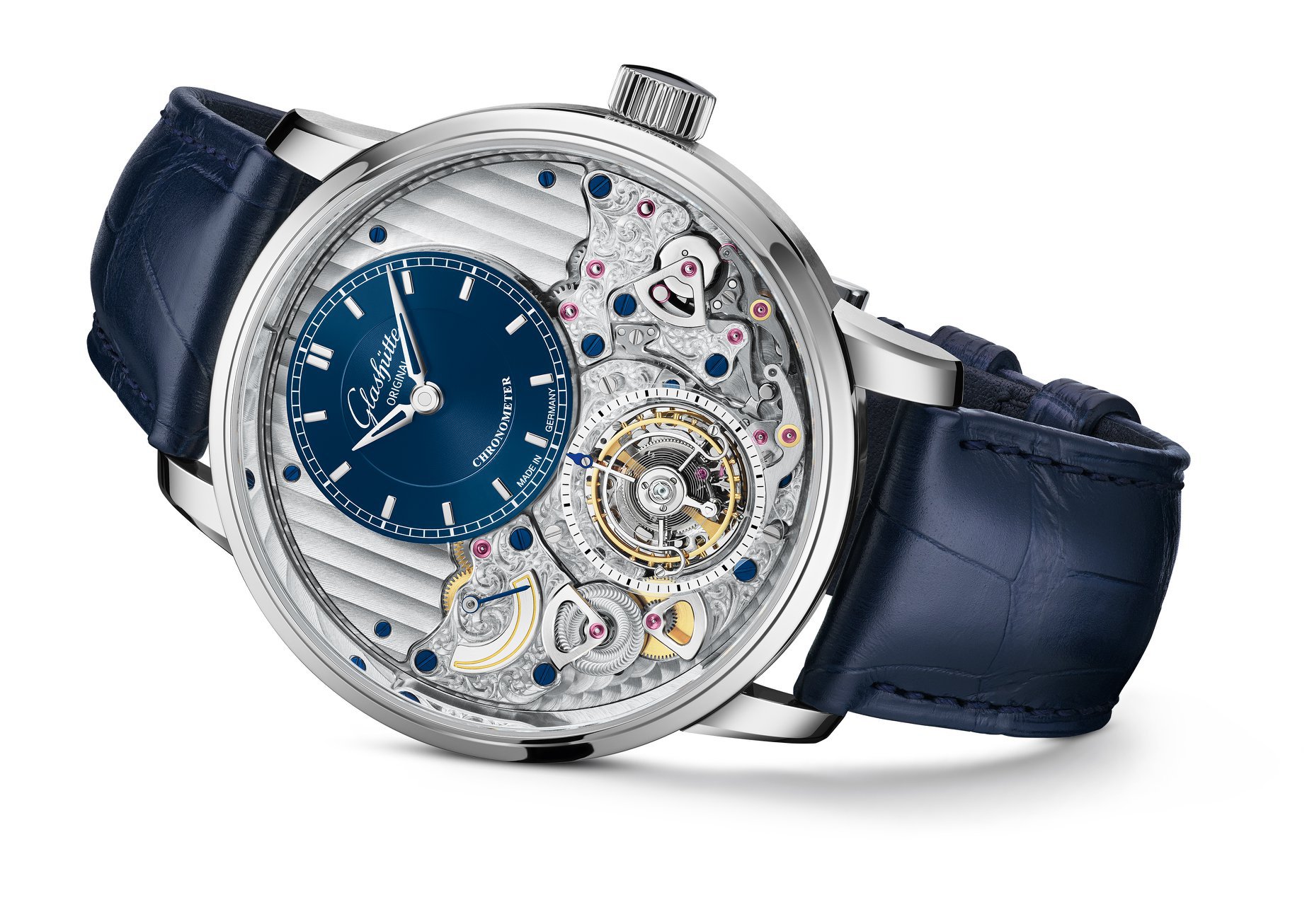 La caja de platino de 42 mm presenta un movimiento con acabados decorativos de gran sofisticación. Bajo la carátula descentrada de color azul galvánico, trascienden unas fascinantes vistas de la combinación de distintos niveles y acabados. El dial y el tourbillon volante se alzan cual torrecillas sobre las mitades inferior y superior del movimiento, lo que otorga al conjunto un espectacular efecto tridimensional. El diseño abierto y un anillo de cristal de zafiro parcialmente transparente que alberga la escala de los segundos atraen la mirada del espectador hacia las profundidades del reloj. Completan la decoración diversos grabados a mano y el clásico acabado barrado Glashütte.