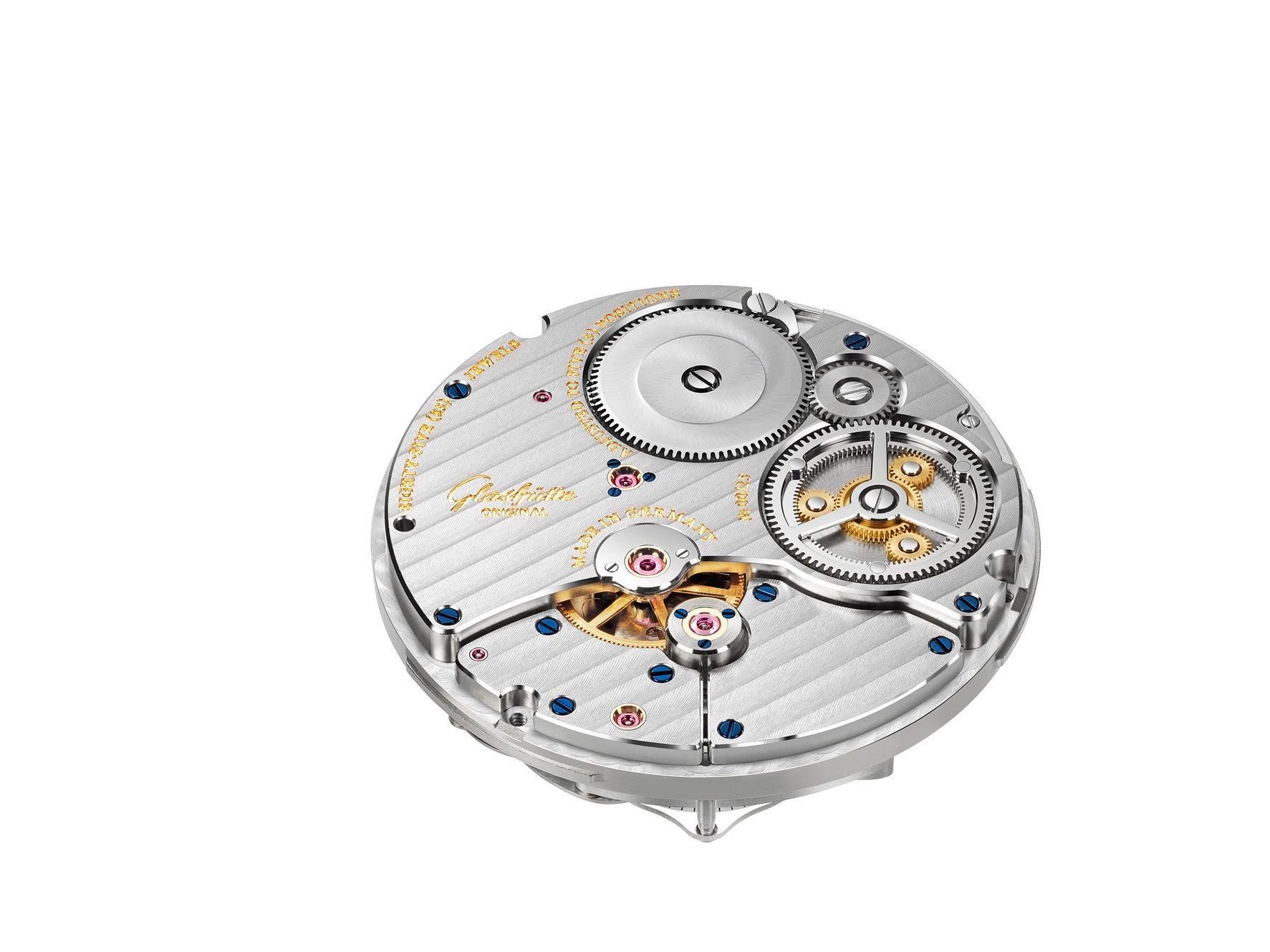 Glashütte Original demuestra que un tourbillon todavía puede cumplir su propósito original. El mecanismo de parada del segundero, la puesta a cero y el fiador del minutero garantizan la sincronización de las agujas de los minutos y los segundos, lo que permite ajustar la hora con enorme precisión: la jaula giratoria del tourbillon se detiene en el momento en que se extrae la corona; puesto que el segundero está montado en la jaula, este también se detiene inmediatamente.