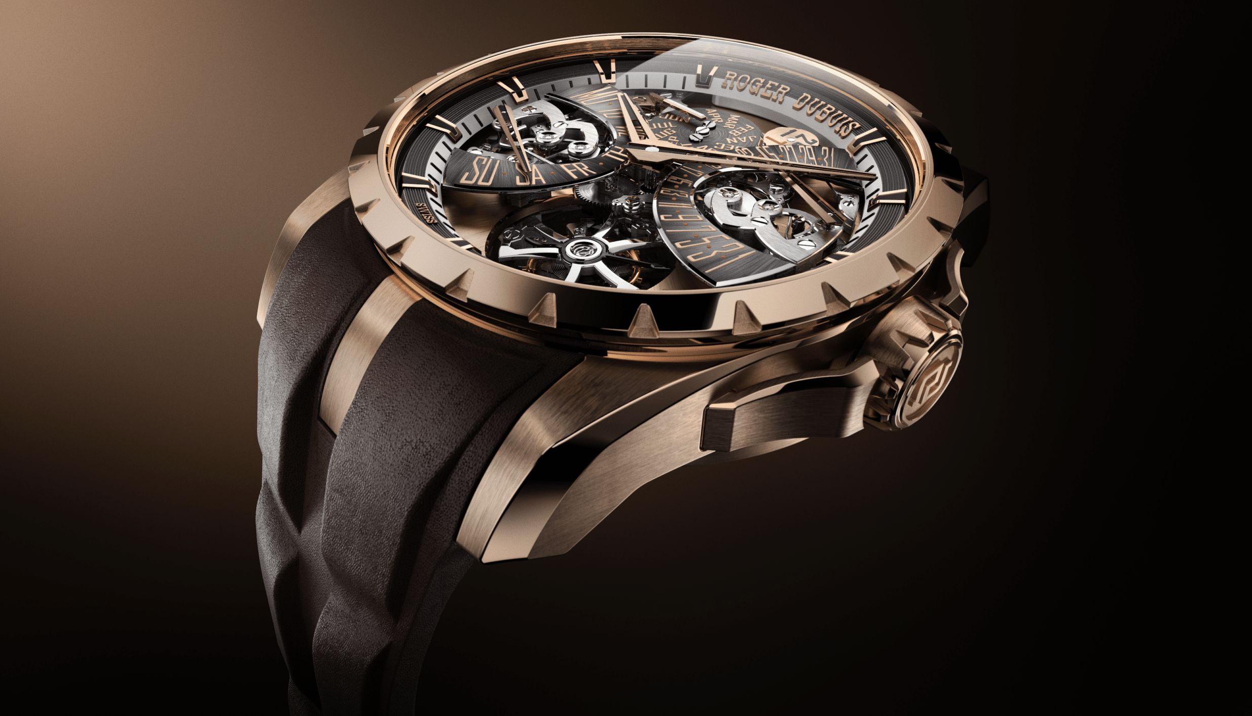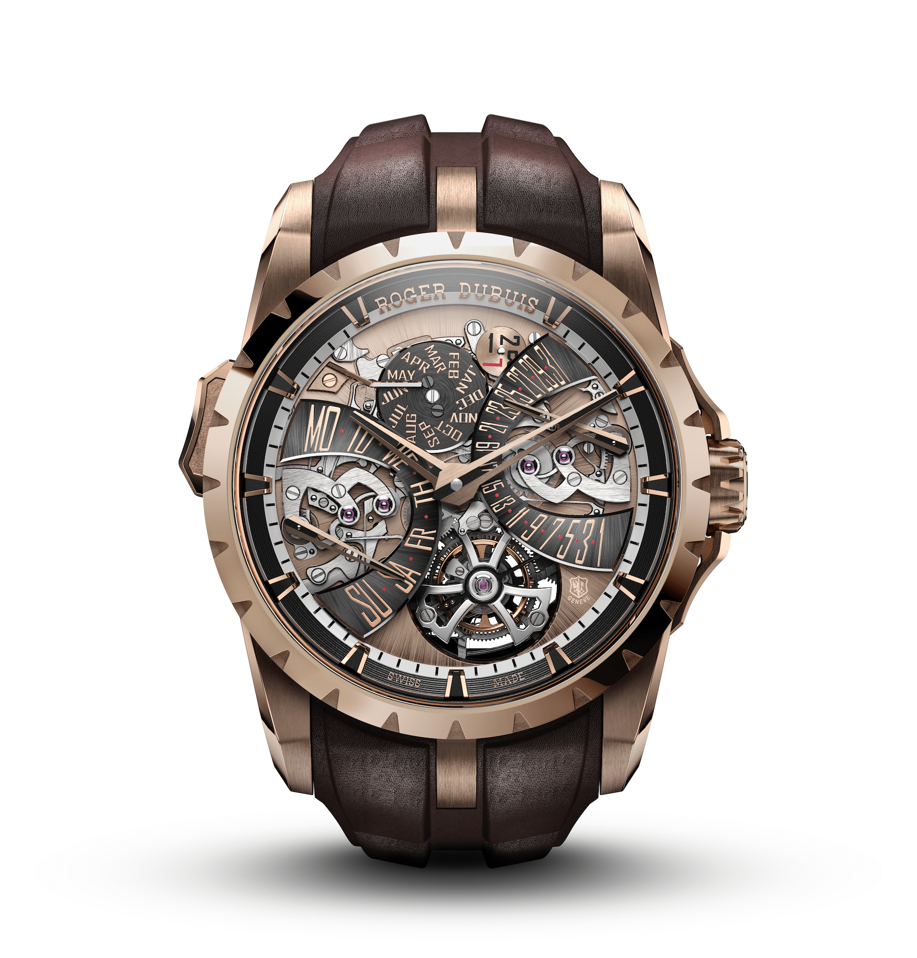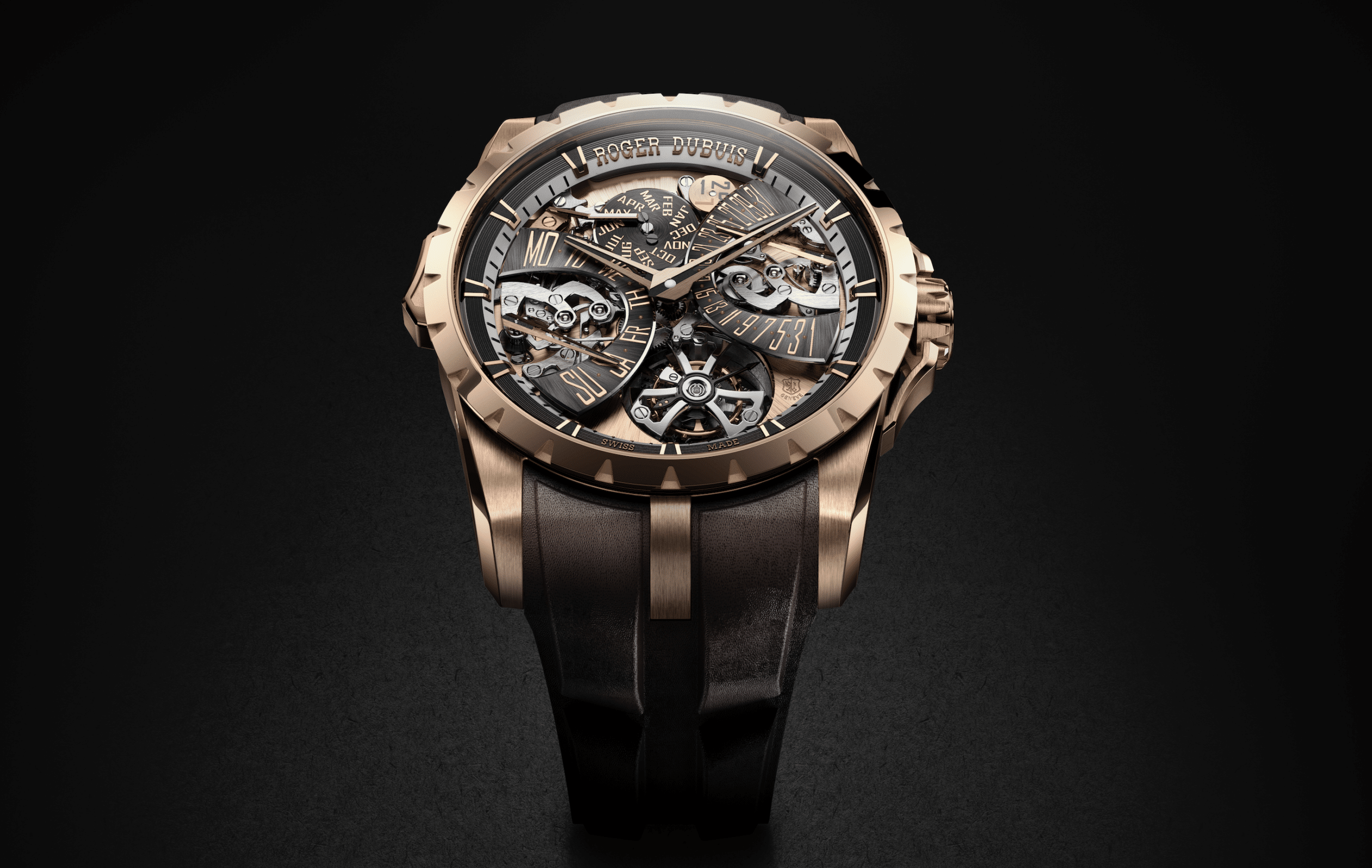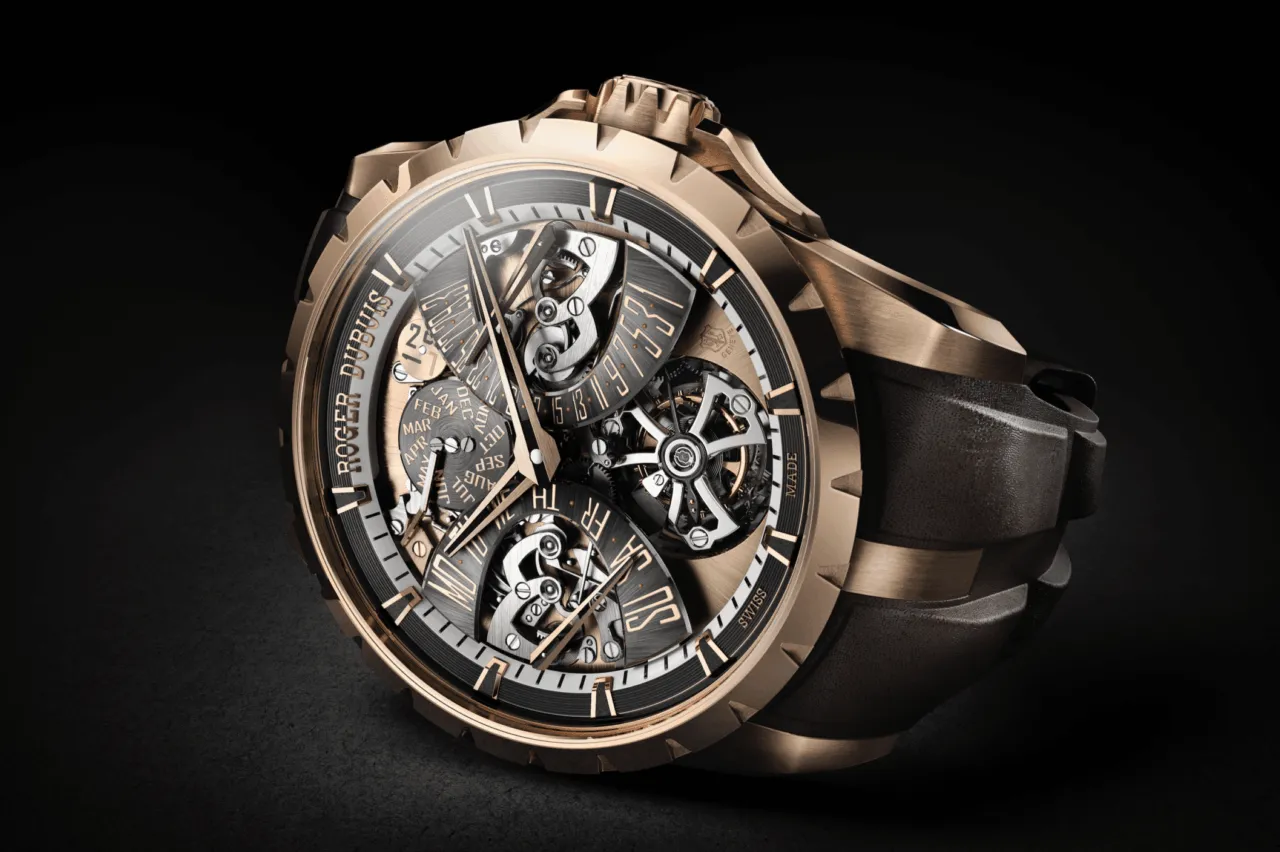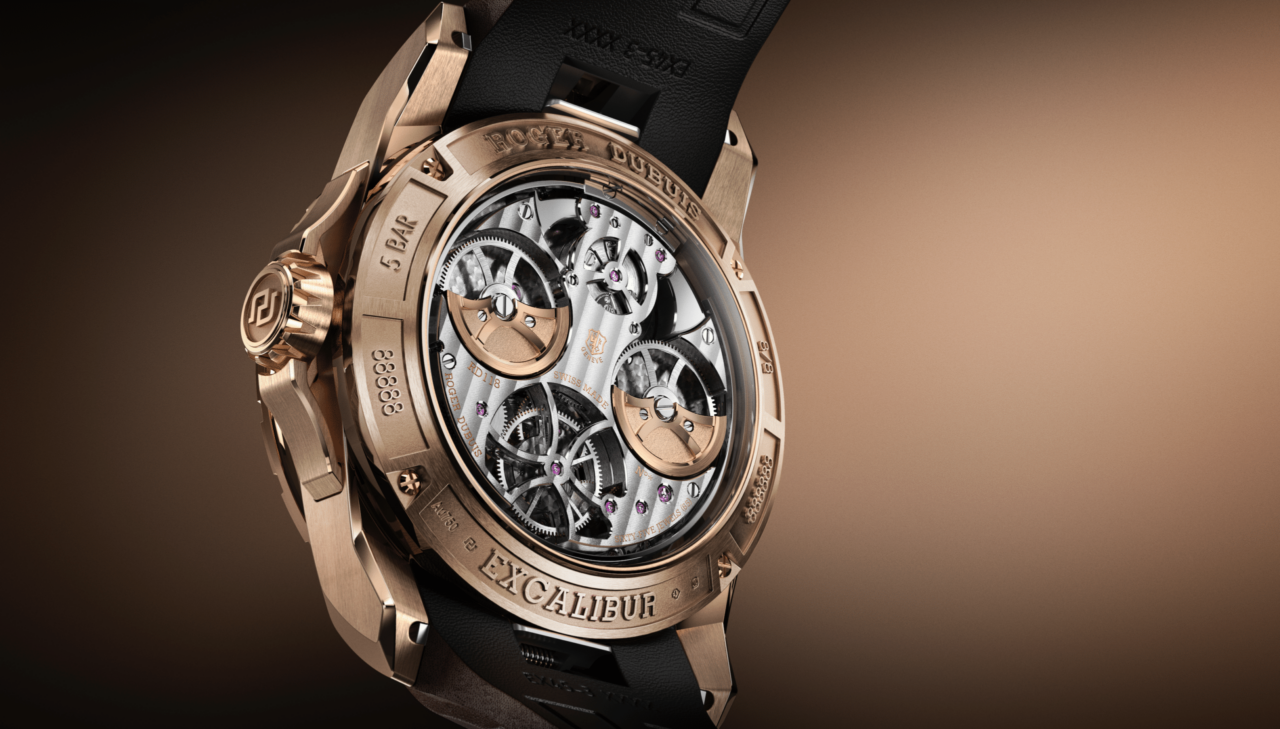 Ubicado entre las 5 y las 6 en punto, es una construcción volante, como todos los tourbillones de Roger Dubuis, y está construido con el estilo característico de la Maison. Desde la jaula pulida tipo espejo inspirada en la Cruz Celta hasta el ingenioso uso de titanio ligero y no magnético, encarna a la perfección el enfoque innovador de la Maison. Excalibur Grande Complication mantiene el espíritu disruptivo y desafiante en cada detalle. Una pieza que cuenta con la certificación del Poinçon de Genève, como todas las creaciones de Roger Dubuis. En caja de oro rosa de 45 mm y correa intercambiable de piel de becerro, es una edición limitada de 8 ejemplares.