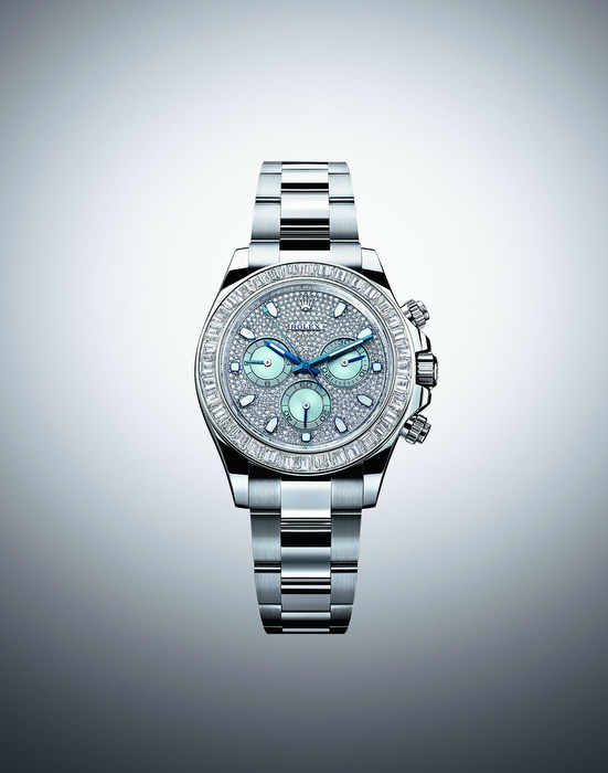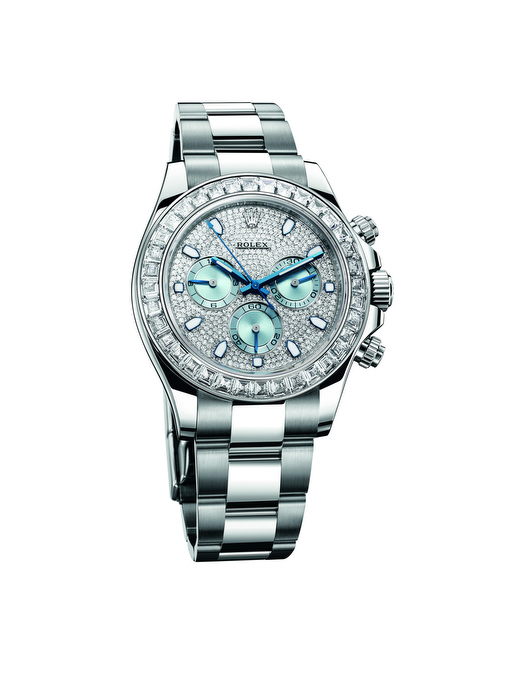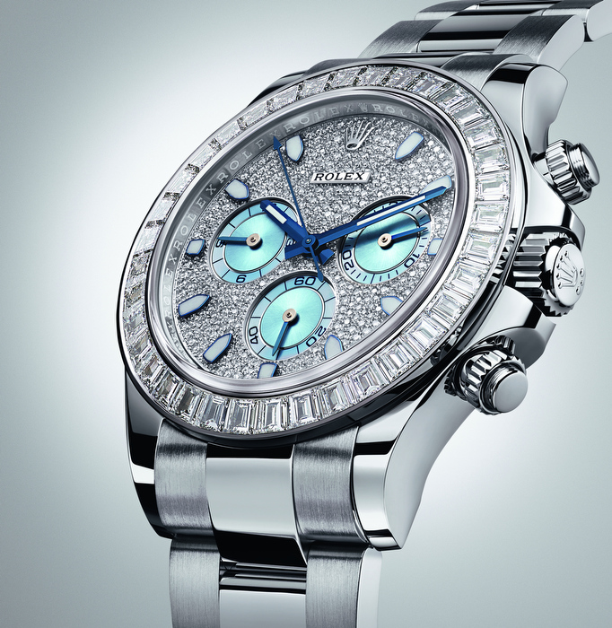 En esta ocasión les compartimos la nueva edición joya del Oyster Perpetual Cosmograph Daytona que aúna la preciosidad del platino 950 con el brillo de los diamantes más puros. En su carátula se extiende un exquisito pavé de diamantes, excepto en los contadores del cronógrafo, que son color azul glaciar, tono raro y exclusivo que Rolex reserva para los modelos de platino. Por su parte, el bisel resplandece con 36 diamantes talla baguette.