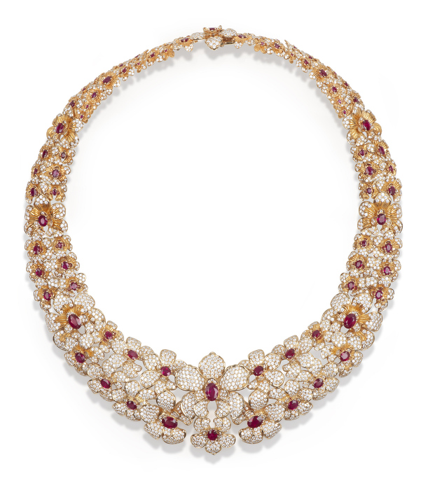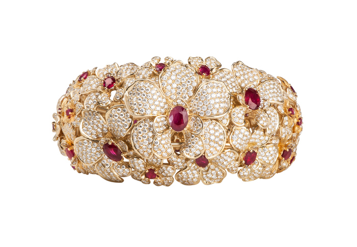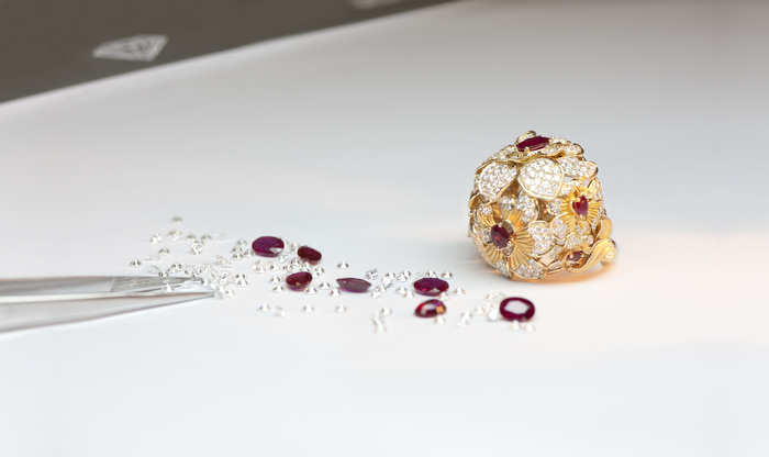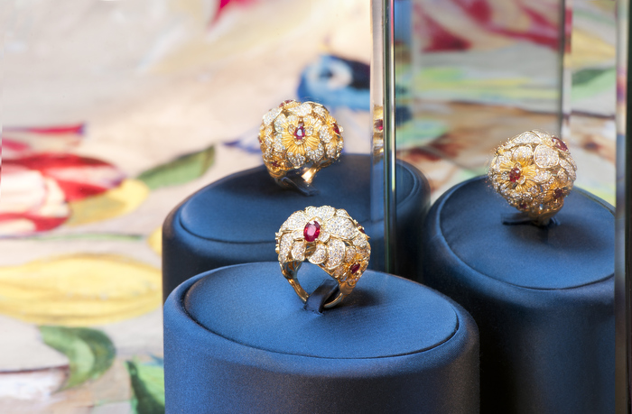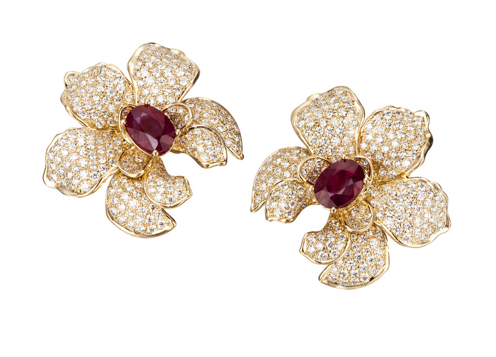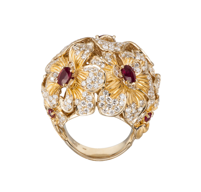 Un trabajo preciosista del oro donde la mini-escultura es protagonista en cada pieza creada en oro amarillo, brillantes y cabujones de rubíes.