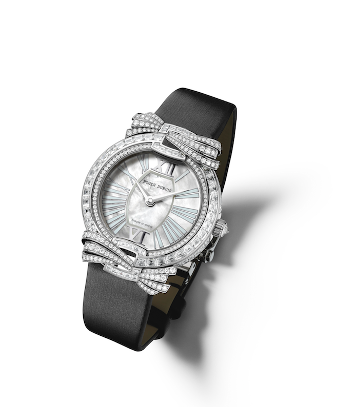 Para embellecer la muñeca, Roger Dubuis lanza su reloj pulsera Velvet Ribbon animado por un calibre RD821 mecánico de cuerda automática. Está pieza limitada a 88 piezas, está conformada por 385 piedras preciosas que suman un total de 8,67 quilates. Su caja de 36 mm hecha en oro blanco, incorpora asas decorativas con diamantes y una hebilla plegable ajustable.