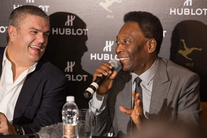 En la ceremonia de apertura de la boutique de Hublot de Río de Janeiro, estuvo presente Pelé, la leyenda internacional del futbol, quien acompañó al CEO de Hublot, Ricardo Guadalupe, y a los propietarios de SARA, Laja y David Zilberman, para presentar el Classic Fusion Chrono Aero Pelé.
