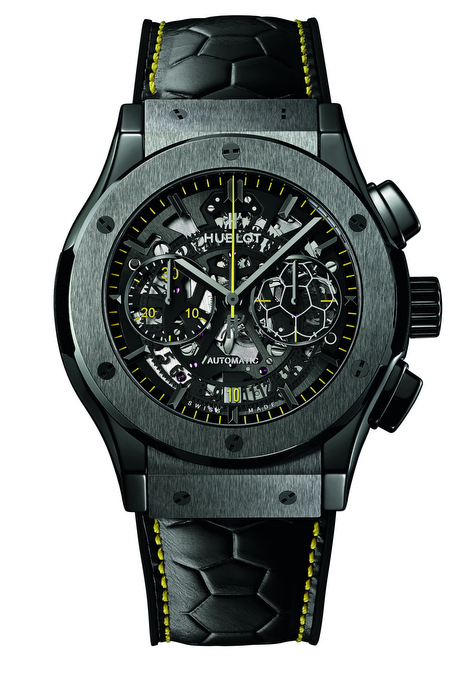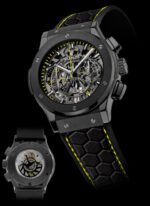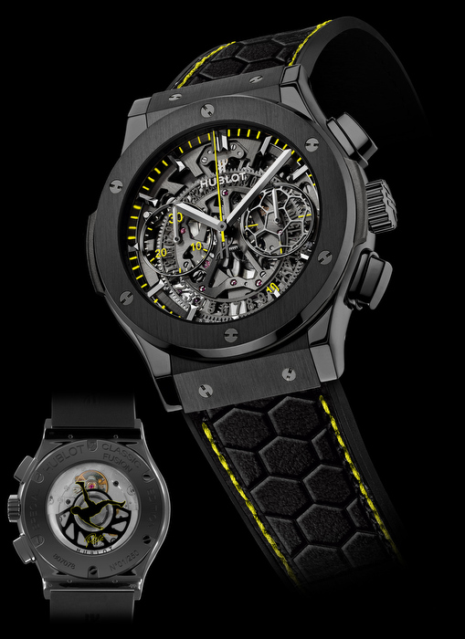 El reloj limitado a 500 piezas únicamente cuenta con una caja de cerámica satinada/pulida de 45 mm de diámetro y un movimiento de cronógrafo Aero Hublot mecánico automático. La carátula de zafiro cuenta con índices pulidos y facetados y calcados en polvo plateado y amarillo. En el fondo de caja del reloj podemos encontrar la famosa firma de Pelé.