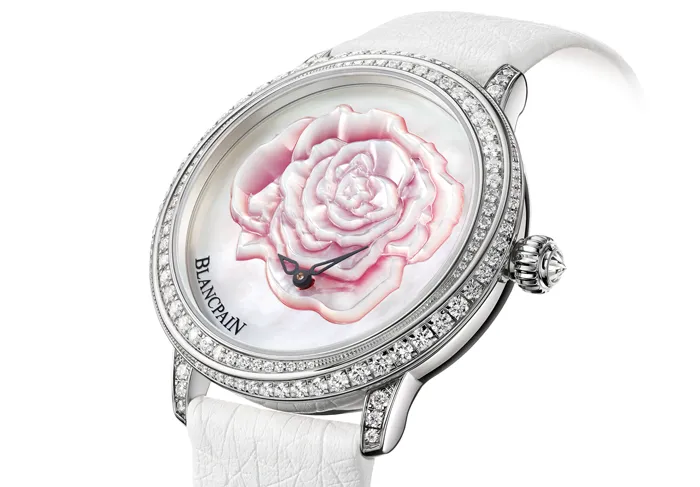 En esta ocasión Blancpain vuelve a poner su conocimiento técnico especializado al servicio de la estética con el fin de proponer un reloj mecánico decididamente femenino. El nuevo modelo del día de San Valentín 2015 presenta una carátula de nácar decorada con una majestuosa rosa marqueteada, técnica que destaca la finura del trabajo de los artesanos especializados en la creación de carátulas. Como puede apreciarse, fue elaborada minuciosamente y cada pétalo está delicadamente esculpido en nácar blanco. Por su parte, la rosa en relieve se recorta y se tiñe antes de ser ensamblada. Dejando más o menos transparentar el color, los distintos grosores de nácar dan vida a un sutil degradé de rosas.