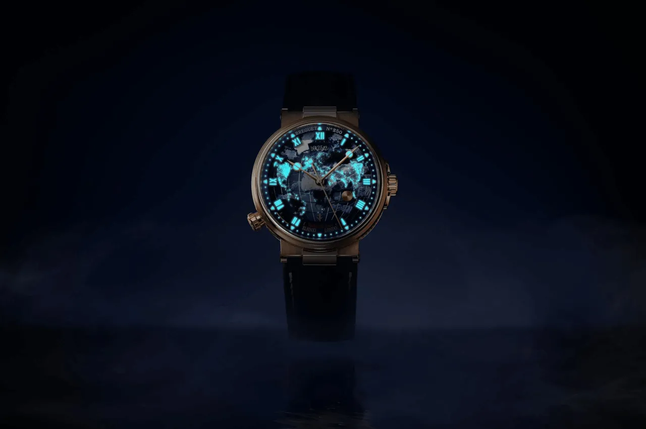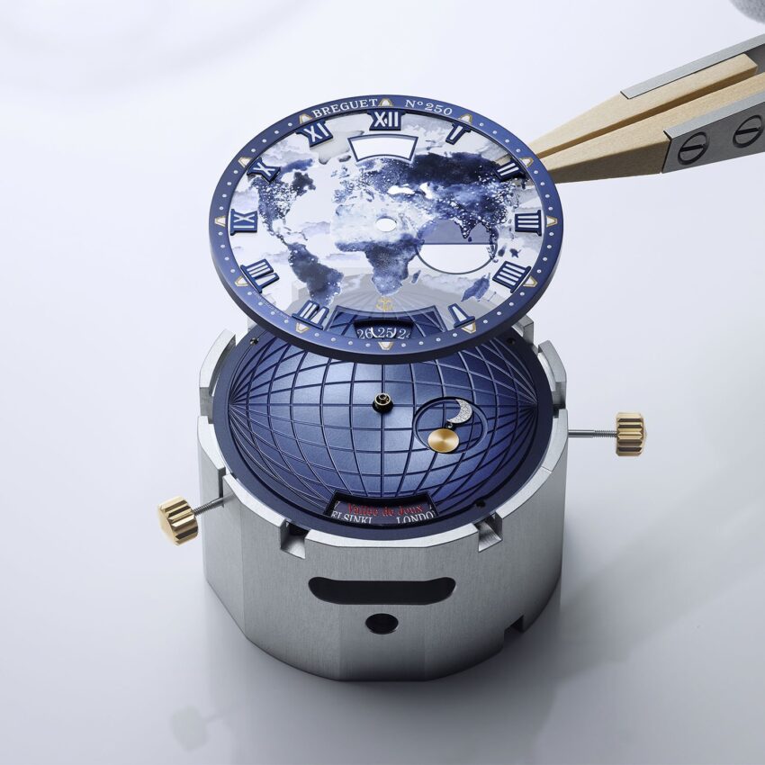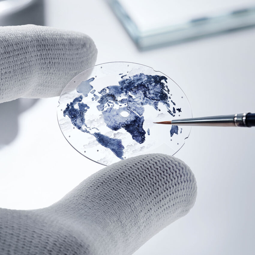 En el reverso del zafiro, los artesanos de Breguet dibujan los continentes con esmalte en miniatura, trabajando en espejo para que aparezcan correctos al ensamblar la esfera. Tras una cocción a alta temperatura, las formas adquieren profundidad y definición. Posteriormente, sobre el anverso, se pintan delicadas nubes esmaltadas que flotan sobre los océanos, aportando dinamismo y realismo a la escena. En este Breguet Marine Hora Mundi 5555, la Tierra cobra vida mágicamente, con continentes precisos y cielos cambiantes, distintos en cada ejemplar. Ningún coleccionista tendrá una esfera idéntica a otra, reforzando la exclusividad de esta serie limitada.
