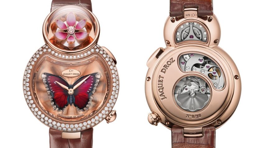 El cuidado de las formas, los detalles y las artes se expresan en una pieza de relojería destinada a la mujer: Jaquet Droz Lady 8 Flower, producto de Ateliers d´Art.