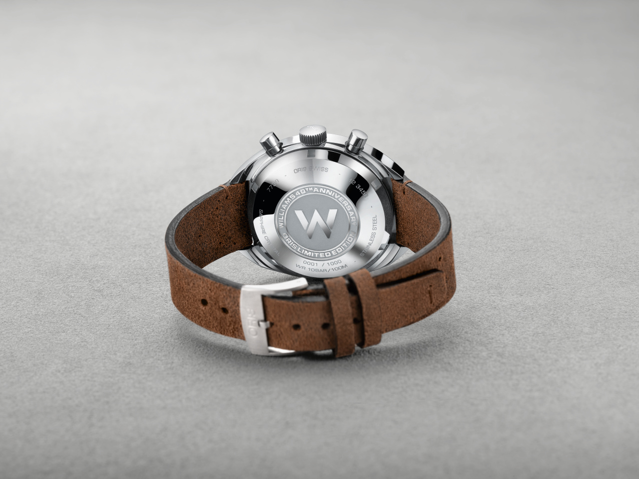 Para fortalecer el vínculo de la referencia con Williams, su diseño engalana un número importante de detalles que aluden al equipo. Tal es el caso de la aguja segundera central del cronógrafo y la escala de minutos color “azul Williams”, mientras que al fondo de la caja es posible observar el logo “Williams Racing” grabado. Para sostener el reloj a la muñeca, hay tres opciones disponibles: una correa en piel marrón, una correa de caucho negra o un brazalete metálico articulado.