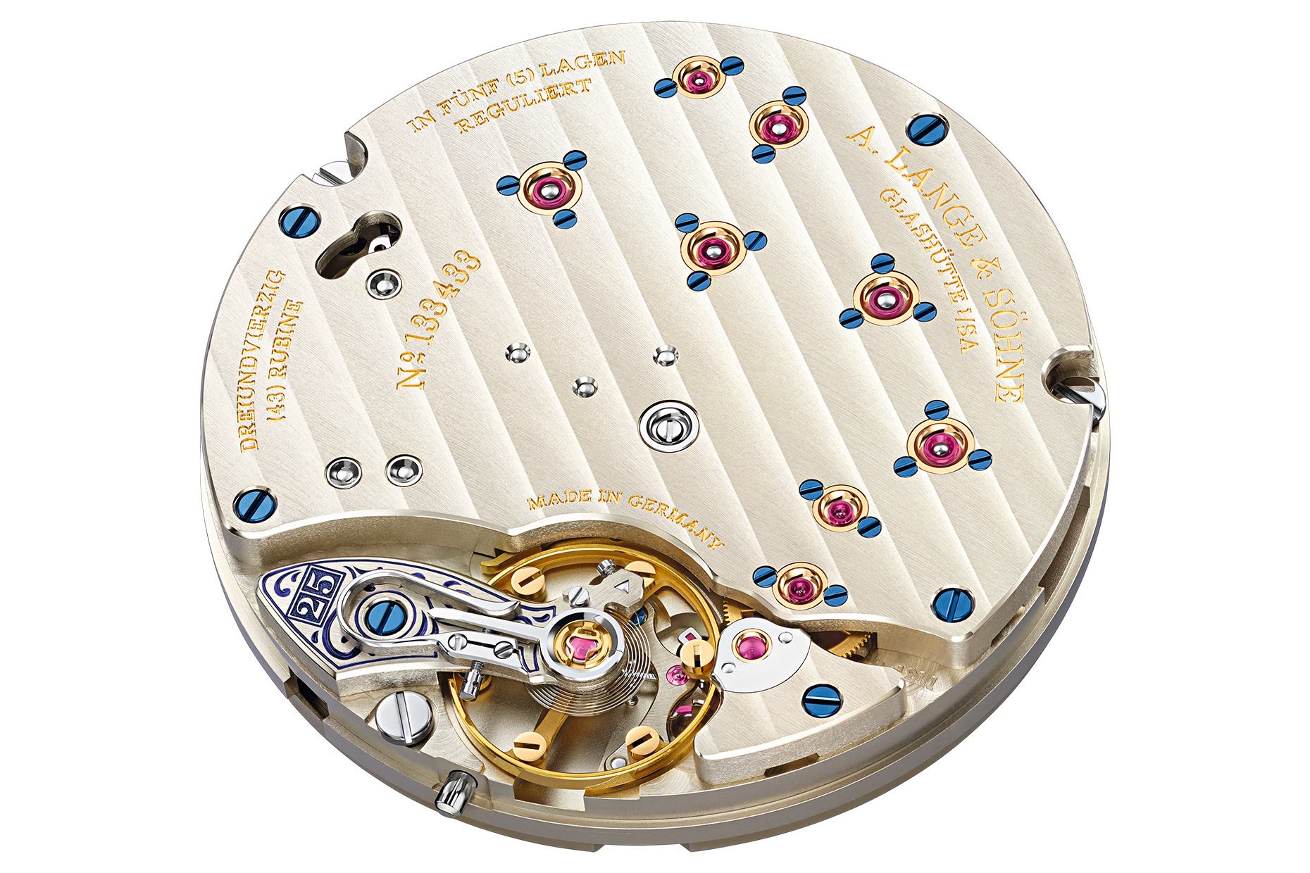 El nuevo motor cuenta con un doble barrilete que ofrece 72 horas de autonomía y que, como en cualquier Lange, posee una estructura de platina de tres cuartos desarrollada en alpaca natural; ocho engastes de oro atornillados y puente de volante grabado a mano. En este caso, reloj de aniversario, éste lleva la inscripción 25.
