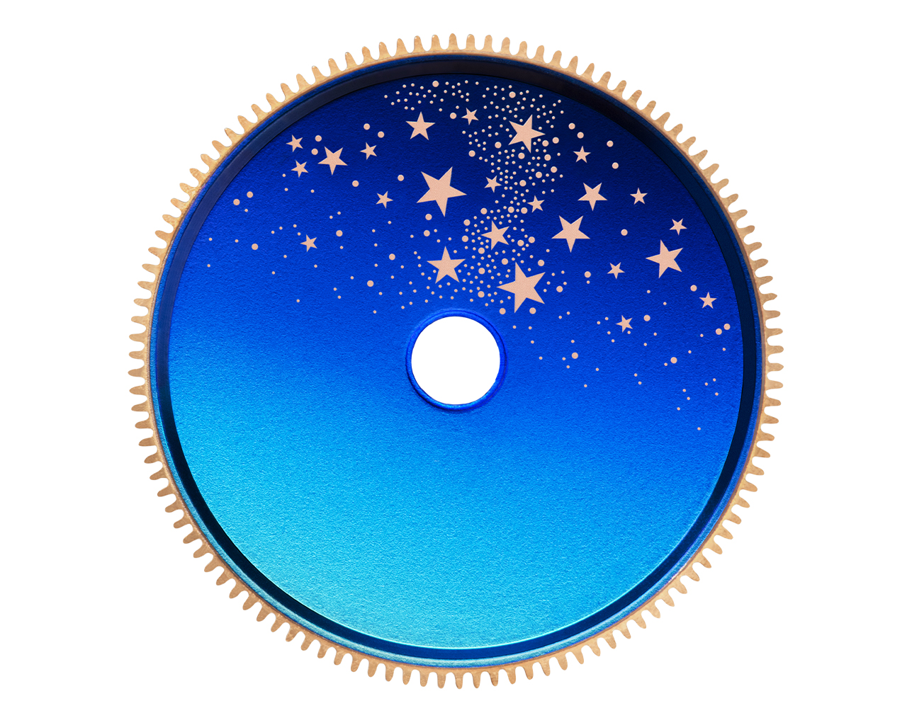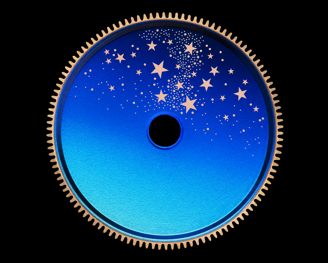 En el primer plano, una luna de oro macizo separada sigue su órbita. Por detrás de ella, un disco celeste igualmente de oro macizo efectúa una revolución en 24 horas exactamente. Las diferentes horas del día se representan en el disco con diferentes tonos de azul producidos por efectos de interferencia. Por el día se presenta un cielo claro sin estrellas, mientras que por la noche aparece un cielo oscuro en el que se destacan las estrellas recortadas con láser. De este modo, la luna siempre orbita por delante de un telón de fondo realista que sirve para ajustar la hora al mismo tiempo que de indicación día/noche.