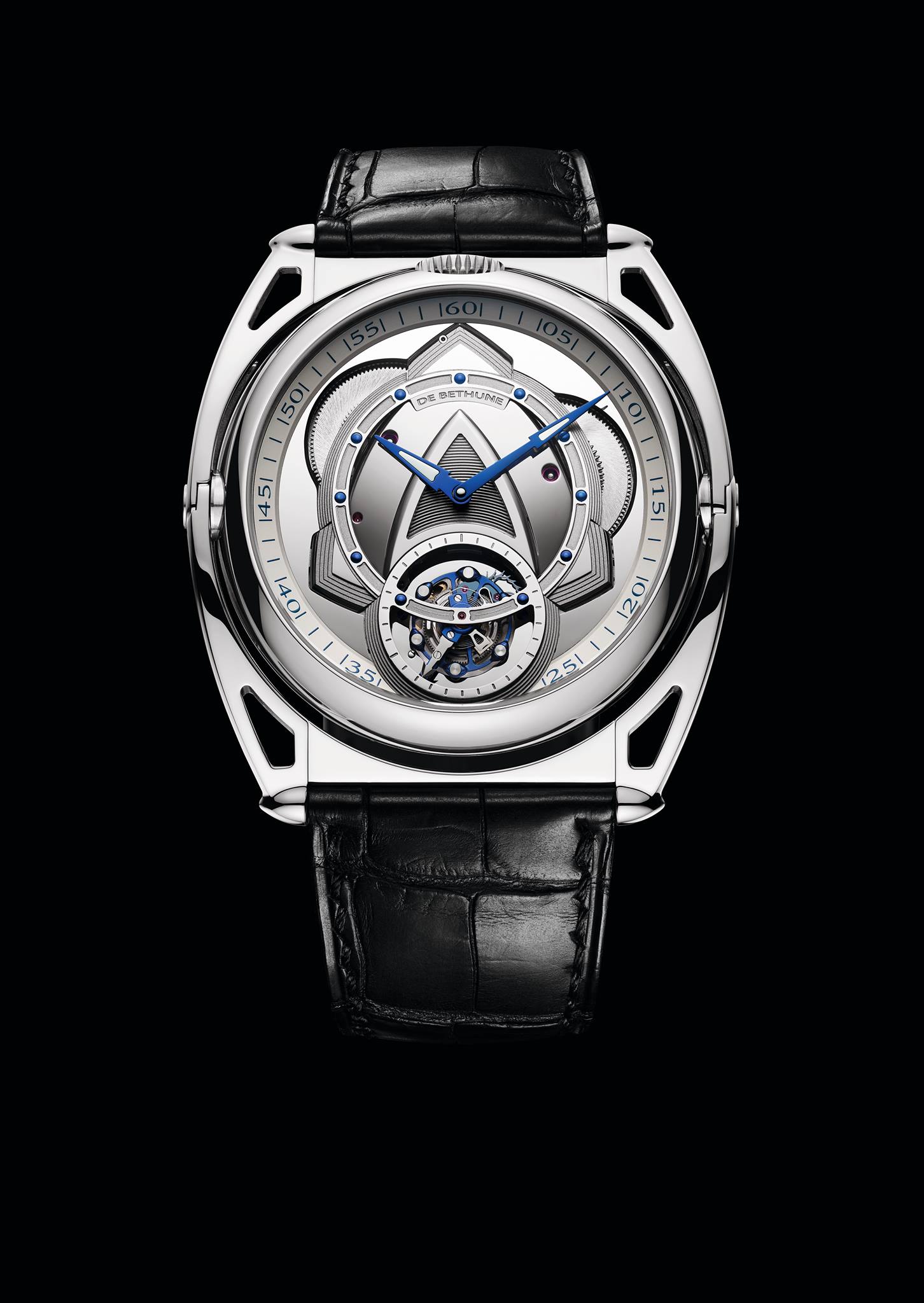 El nuevo De Bethune es un reloj doble cara, que funciona a través de una caja pivotante resultando en dos diferentes ejecuciones de carátula que fusionan el pasado y el futuro como idea central. Una de las vistas revela un look totalmente contemporáneo y apegado a lo que la firma nos tiene acostumbrados: diseño tipo nave espacial con tourbillon a las 6 h, agujas para horas y minutos. Mientras que la otra cara luce un diseño muy tradicional, que celebra los acabados históricos de la Alta Relojería como un dial guilloché; agujas azuladas tipo Breguet de titanio para horas, minutos y segundos. La corona, típica de De Bethune luce a las 12 horas, mientras que los cuernos “flotantes” esqueletados brindan una ejecución de excepción.