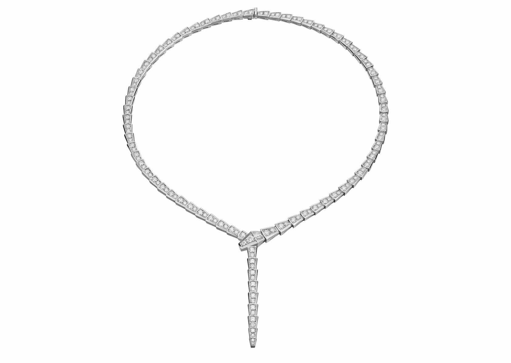 Tanto el collar como la pulsera y los aretes están fijados a mano con piedras de diferentes cortes para crear una peculiar ilusión de movimiento al usar la pieza. Tan suave y seductora como una serpiente, el collar de 8 quilates de diamantes desliza su cola a través del escote de quien la usa. La pulsera concibe una nueva version del clásico brazalete de tenis, ahora incorporando el estilo innovador de la firma.