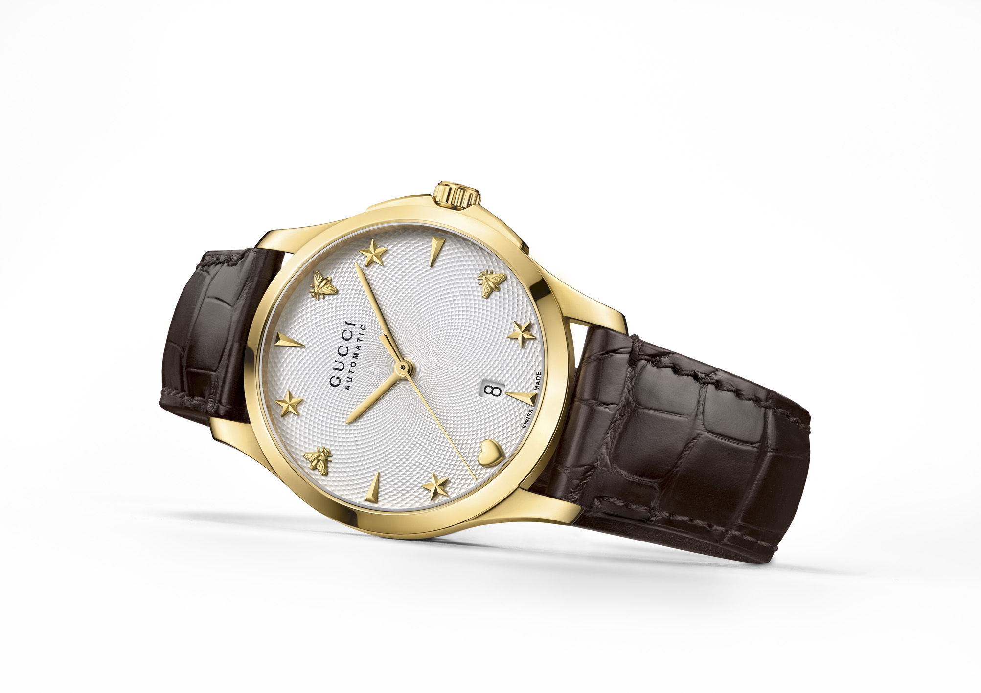 Los tres relojes incorporan un movimiento ETA 2824 y los mecanismos interiores y la masa oscilante pueden admirarse a través de un fondo de caja transparente. Las carátulas presentan el sello “Gucci Automatic” a las 12 h y la fecha a las 6 h. Todos se sujetan a la muñeca por medio de una correa negra o marrón de piel de aligátor.