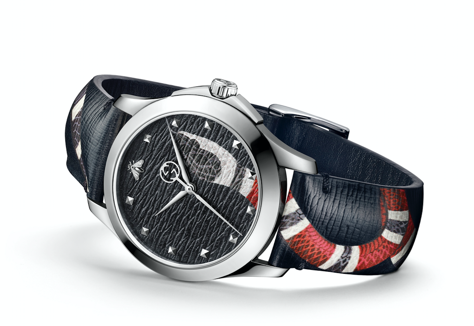 El reloj más deportivo de Gucci ahora se encuentra acentuado por la incorporación de los nuevos motivos de la Casa en la carátula. Todos con una tendencia muy contemporánea que hace sentido con el resto de las colecciones, ya que presenta detalles como el tigre y la abeja en su estética. En las versiones extragrandes de 45 mm, las correas se presentan en nailon con estampado azul-rojo o verde-rojo de Gucci. El reloj cuenta con detalles como la abeja o el tigre finamente bordados en la carátula, mientras que en la caja de PVD negro es posible apreciar un bisel giratorio unidireccional y las agujas luminiscentes.