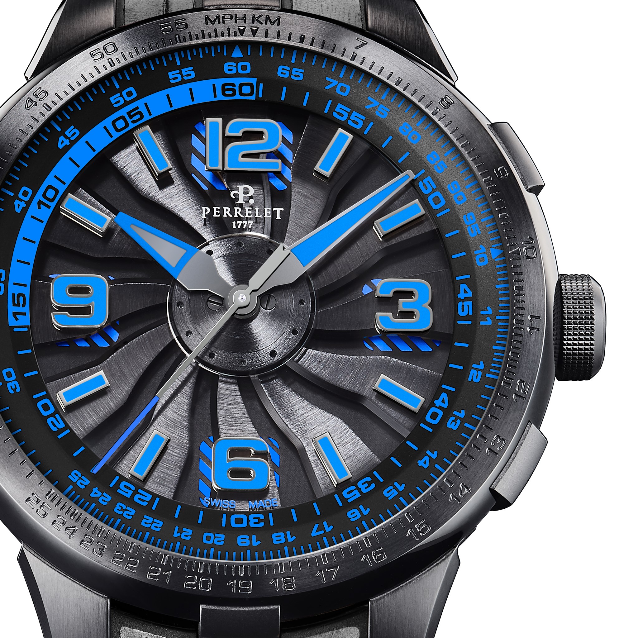 Para asegurar una legibilidad óptima en todas las condiciones de luz, los índices y los números árabes a las 3, 6, 9 y 12 horas, que se aplican en el disco de cristal de zafiro encima de la turbina, son luminiscentes, al igual que las agujas. En los modelos de camuflaje y azul eléctrico, por ejemplo, la aguja horaria se escoge en el mismo color que las rayas debajo de las aspas. Las escalas periféricas de la regla de cálculo en el reborde y la punta del segundero central en los cuatro modelos también coinciden con el color de las rayas. El bisel giratorio bidireccional se acciona por la corona a las 3, mientras que la hora se ajusta a través de la corona integrada a las 9.