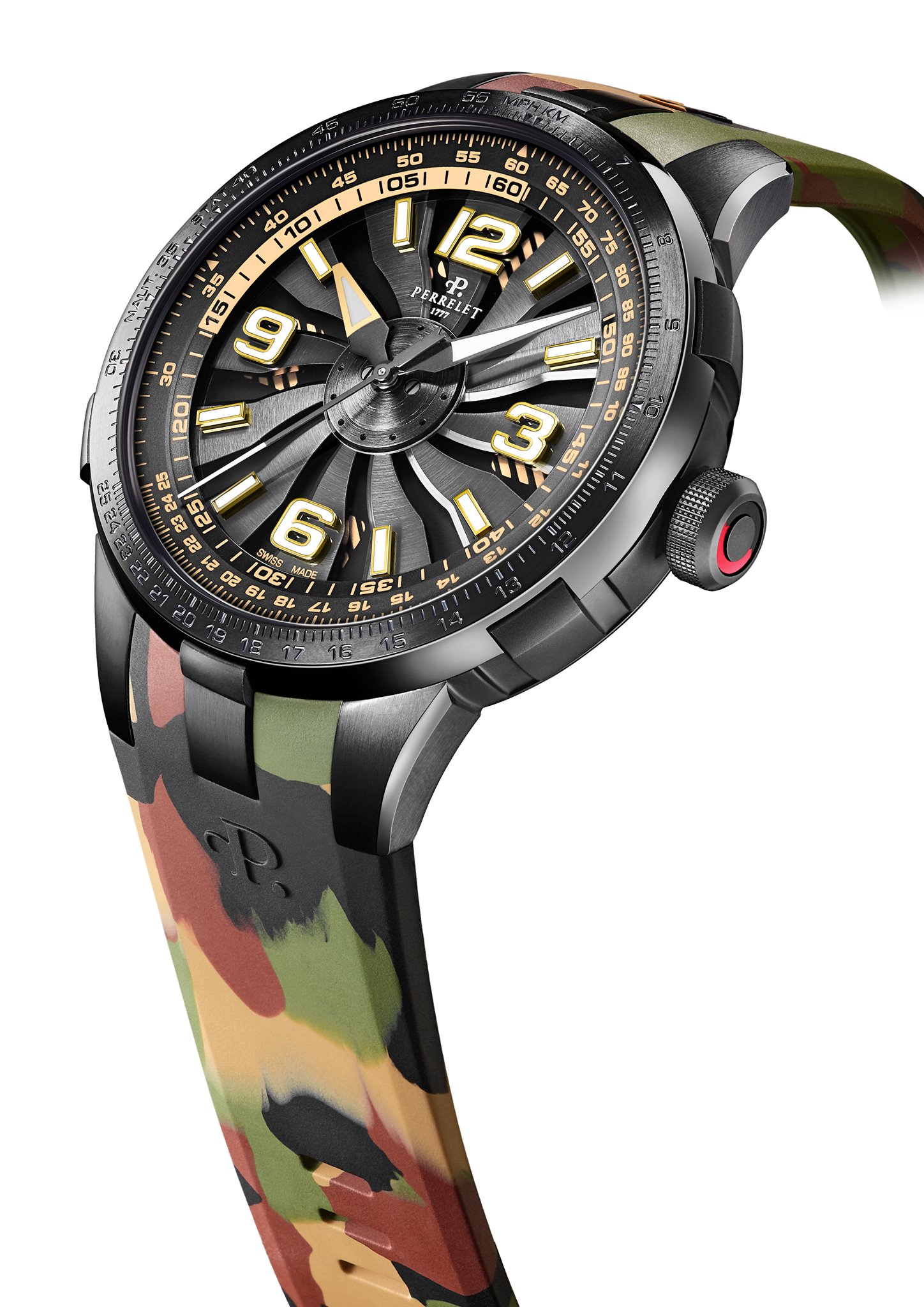 Para completar el paquete, los nuevos modelos Turbine Pilot vienen con una correa bi material (caucho/cuero) y un cierre desplegable personalizado con el logo de Perrelet. Un cuarto modelo con una correa de caucho con estampado de camuflaje ofrece un aspecto más casual.