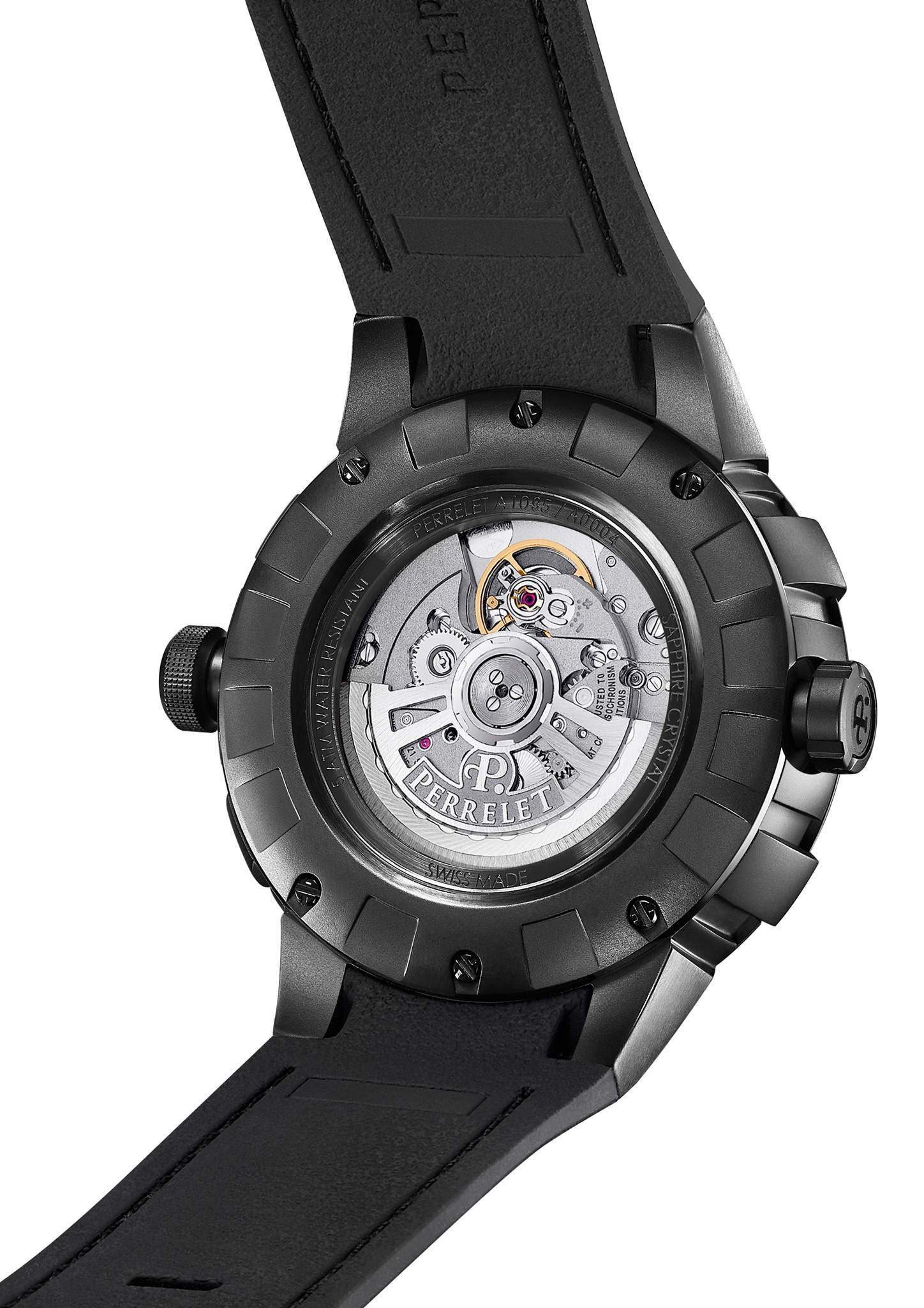 El corazón de este compendio de tecnología innovadora y diseño contemporáneo es el calibre automático P-331-MH de Perrelet. El movimiento está certificado por el COSC y ofrece 42 horas de autonomía. El fondo de cristal de zafiro permite ver los refinados acabados y la masa oscilante rodiada abierta y personalizada con el logotipo de la Casa.