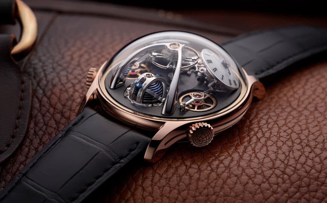 La corona a las 10 en punto, con un globo grabado, establece la hora en el dial izquierdo. Las carátulas de laca blanca estirada con números romanos negros y agujas de oro azulado, la evocación de Büsser de las carátulas de los relojes de bolsillo. Al igual que el LM Thunderdome y el LM Flying T, los diales ahora están inclinados en un ángulo de 50°. Y sí, aumenta la complejidad del movimiento que necesita transferir energía de planos horizontales a verticales a través de engranajes cónicos.