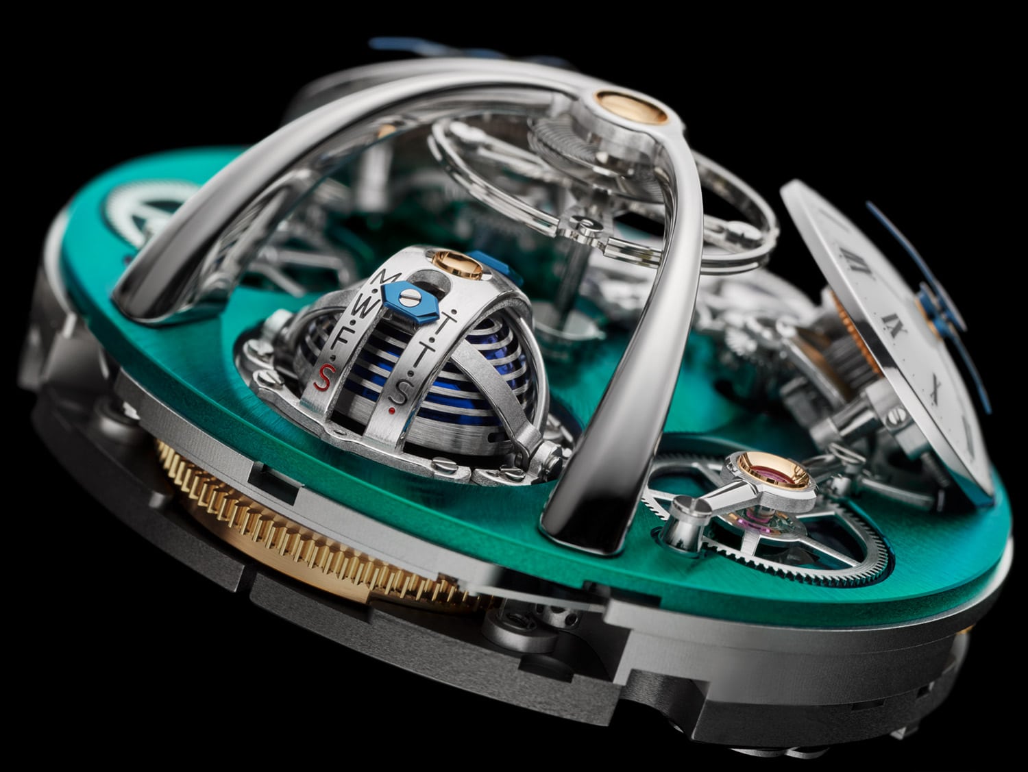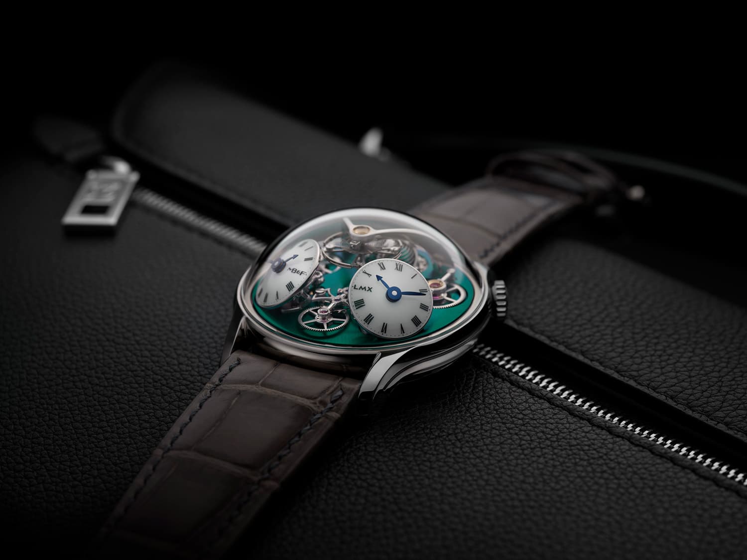 La arquitectura dinámica en 3D y la animación del LMX se mantienen controladas por la elegante simetría: las dos coronas se reflejan en las dos grandes ruedas del dial y los dos subcarátulas inclinadas, y el indicador de servicio de potencia hemisférico está compensado por el pequeño rueda de segundos dejando el centro del escenario al órgano regulador.