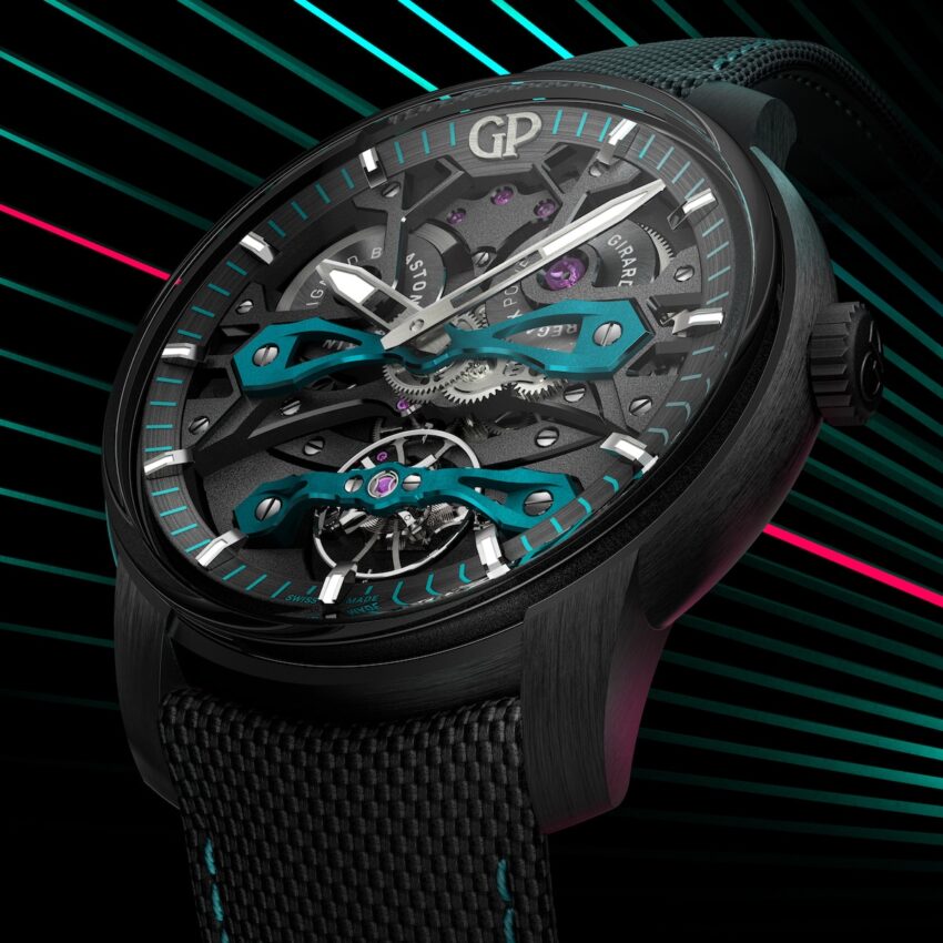 Por otro lado, Girard-Perregaux también presentó el reloj Neo Bridges Aston Martin Edition. Presentado en Dubai Watch Week 2023, esta visión totalmente esqueletada deja a la vista el espectacular calibre GP084000-2164 con funciones de horas y minutos. Este movimiento automático se caracteriza por su diseño especialmente pensado para evocar a los coches de la marca. Además, presenta el clásico color verde inmediatamente asociado con el fabricante británico. El modelo está disponible en una caja de 45 mm hecha en titanio con DLC negro y está limitado a solamente 250 piezas. Lee nuestra nota de esta pieza aquí.