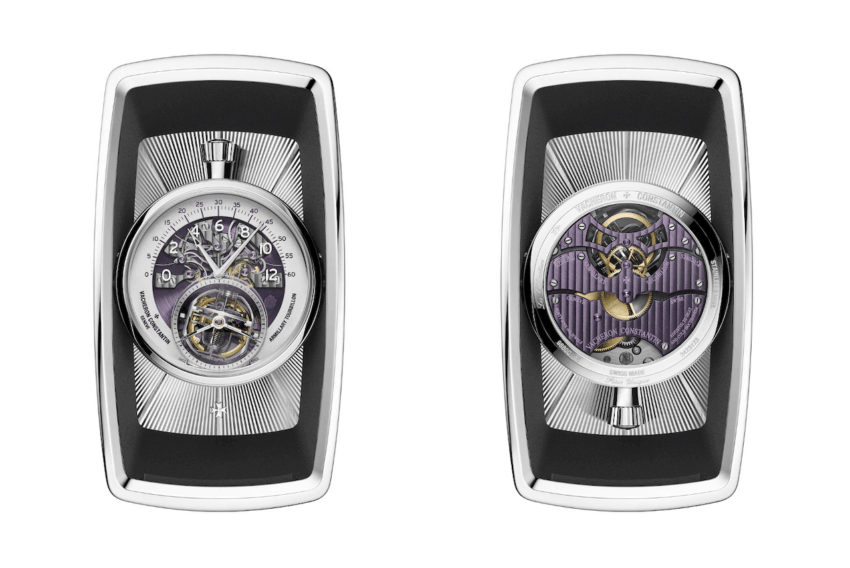 La pieza evoca las formas, materiales y colores del vehículo en el que está basado. El soporte en el que se encuentra permite girar 180 grados al reloj a fin de ajustar la hora, darle cuerda al mecanismo y admirar el reverso del calibre 1990 de Vacheron Constantin. Este movimiento de carga manual incorpora los avances técnicos del reloj más complicado del mundo. Tiene una indicación bi-retrógrada con retorno instantáneo de tanto las horas como los minutos así como un tourbillon. Es un integrante más que digno para una de las marcas de Alta Relojería más antiguas del mundo. Conoce la pieza a detalle aquí.