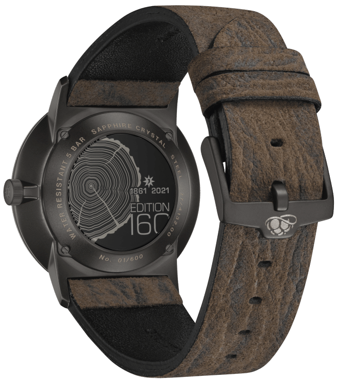 La caja es de acero inoxidable con revestimiento de PVD negro mate, y un diámetro de 39.3 mm, cuenta con cristal de zafiro plano con revestimiento antirreflejos. En el fondo de la caja se aprecia un estampado con motivos de la Selva Negra (los aros de un árbol y el urogallo, ave de una especie amenazada que se encuentra justamente en esta región alemana).
