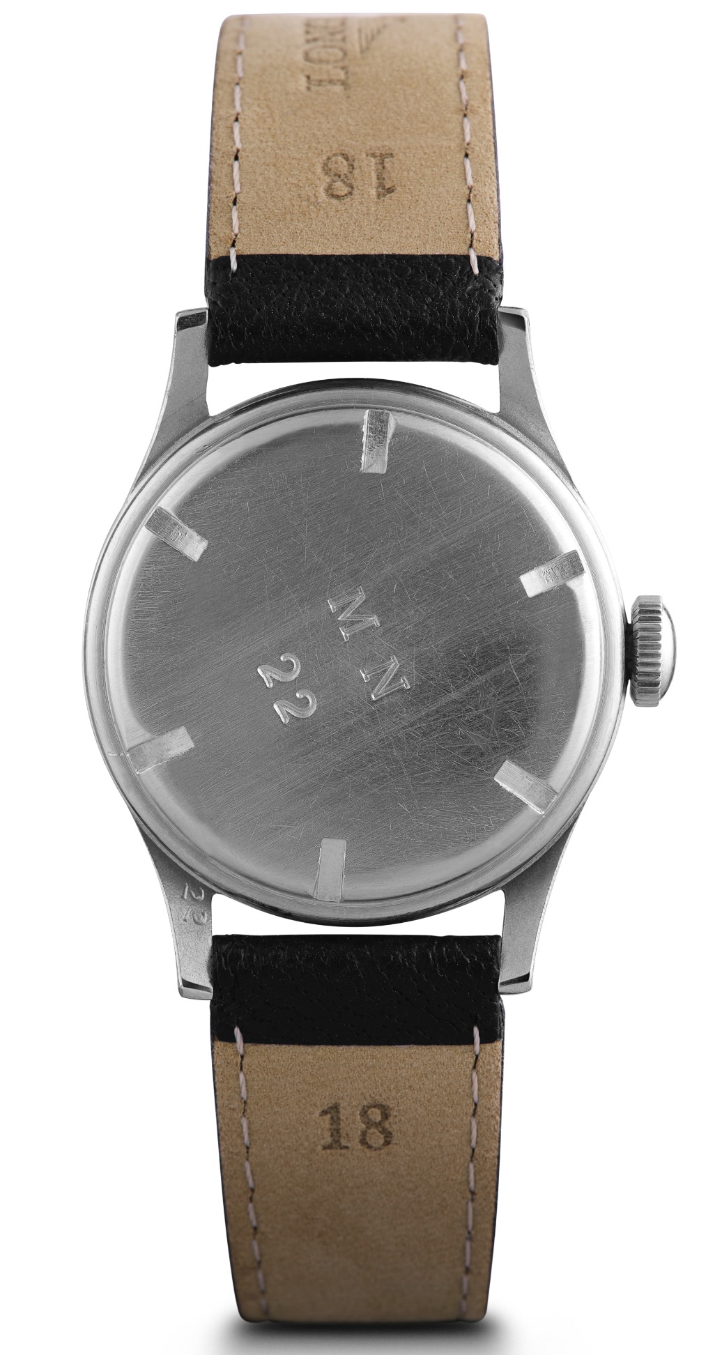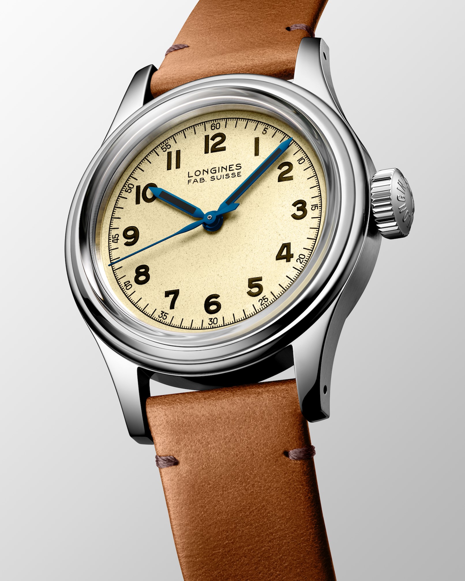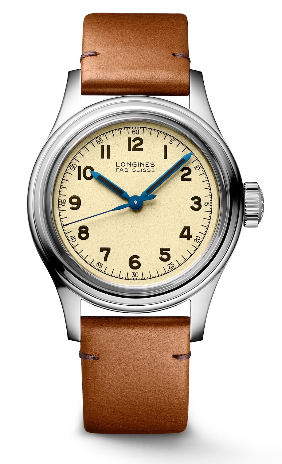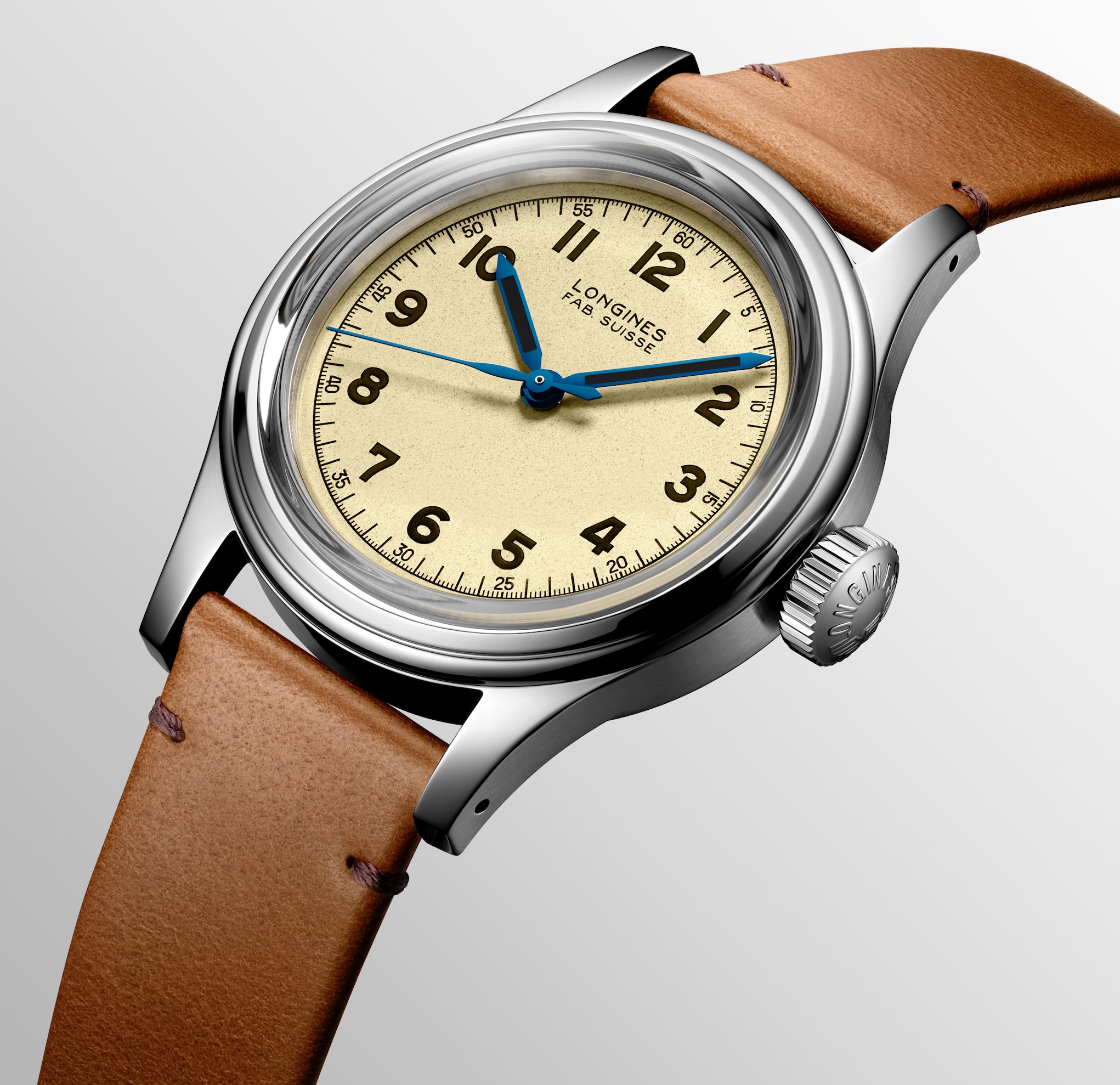 La caja se extiende hasta unos –compactos– 38.5 mm de diámetro, basándose en la minúscula talla de 33,5 mm de diámetro del instrumento original de 1947. Estos relojes contaban con el famoso M.N. grabado en el fondo de la caja, mientras que la carátula leía FAB. SUISSE, antiguo sello de distinción del ahora Swiss Made. En esta nueva pieza los códigos originales continúan gracias a la selección de un cristal de zafiro tipo box que protege una carátula graneada ligera en color beige.