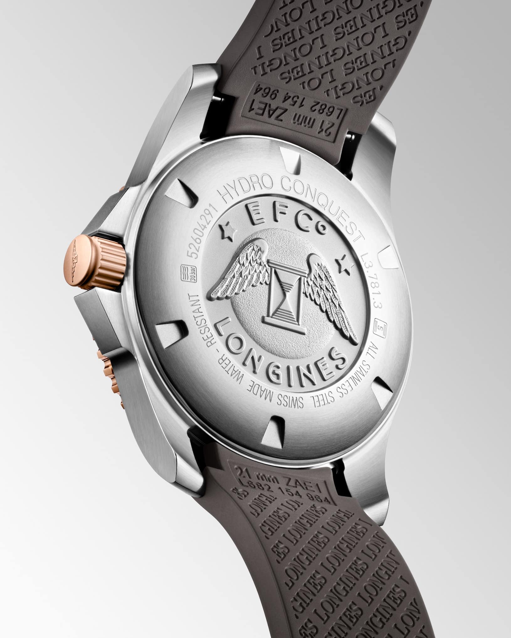 HydroConquest destaca por su estilo audaz y está destinada a los exploradores y buzos exigentes. La hermeticidad de hasta 300 metros, el bisel giratorio unidireccional, la corona y fondo atornillados y la hebilla desplegable con doble seguridad con extensión para submarinismo, son algunas de las funciones que confirman el carácter de HydroConquest.