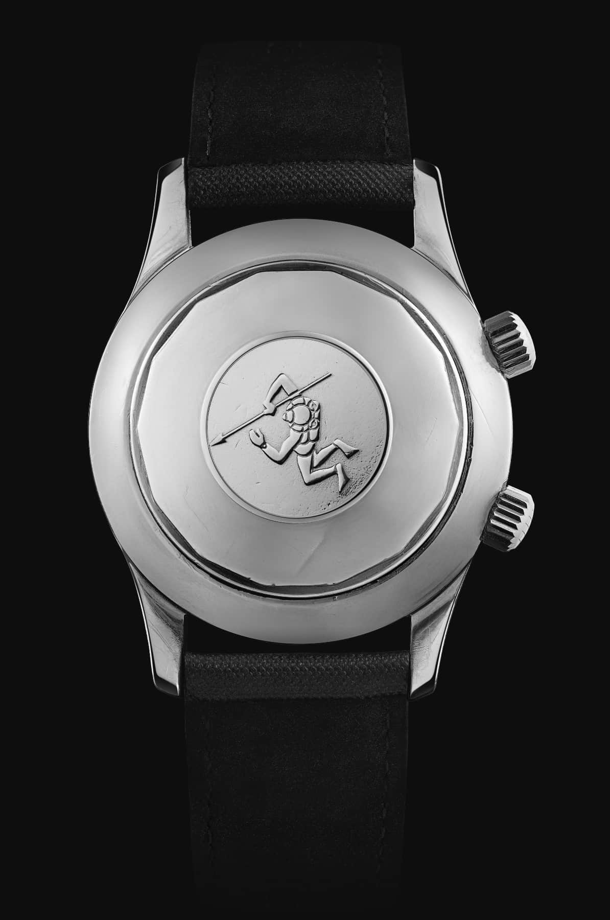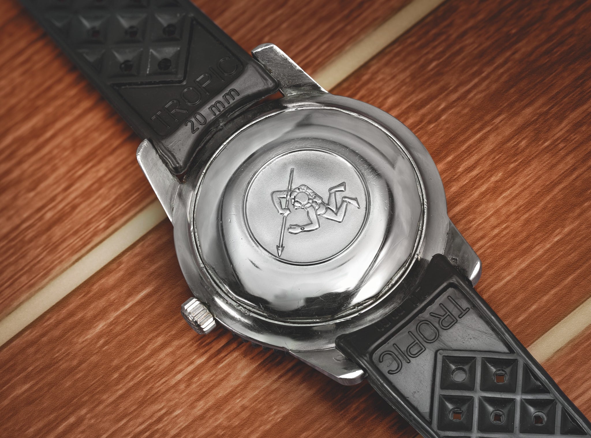 Básicamente una controla las funciones de tiempo y fechador en primera y segunda posición, además de poder remontuar la pieza, como prácticamente todo reloj automático. Y la otra ajusta el bisel de buceo interno (4 h). Dependiendo de la referencia, el reloj se lleva con una correa de cuero marrón vintage o una correa de cuero estructurado azul.