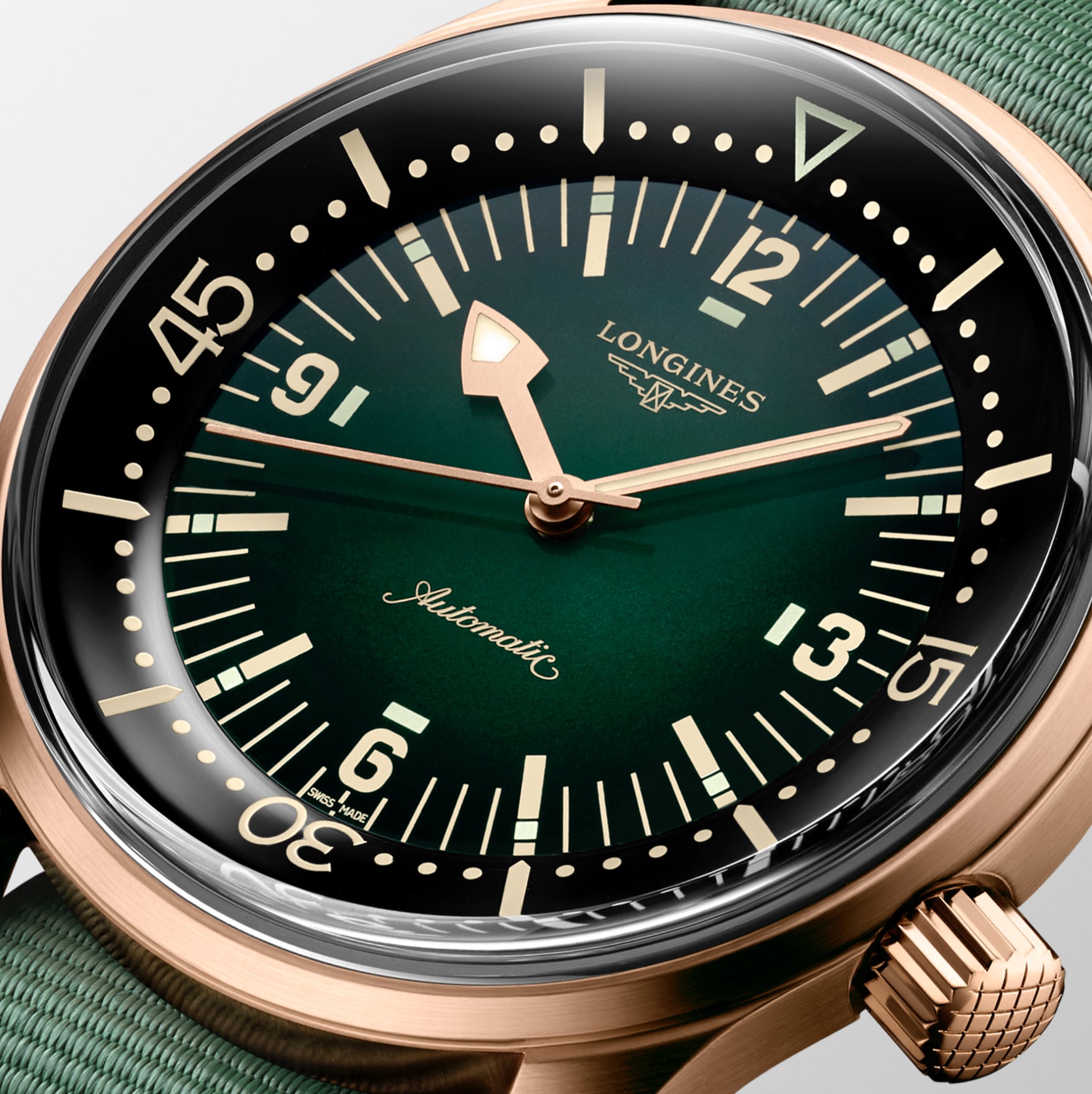 Forma parte de la colección Heritage, por lo que se inspira en uno de los primeros relojes de buceo de Longines. Esta reinterpretación luce un diseño decididamente sesentero, pero cargado de contemporaneidad a partir del nuevo material para la caja: bronce cálido, que se embellece con el tiempo formando una pátina específica que le coloca como pieza única de acuerdo al PH de su propietario.