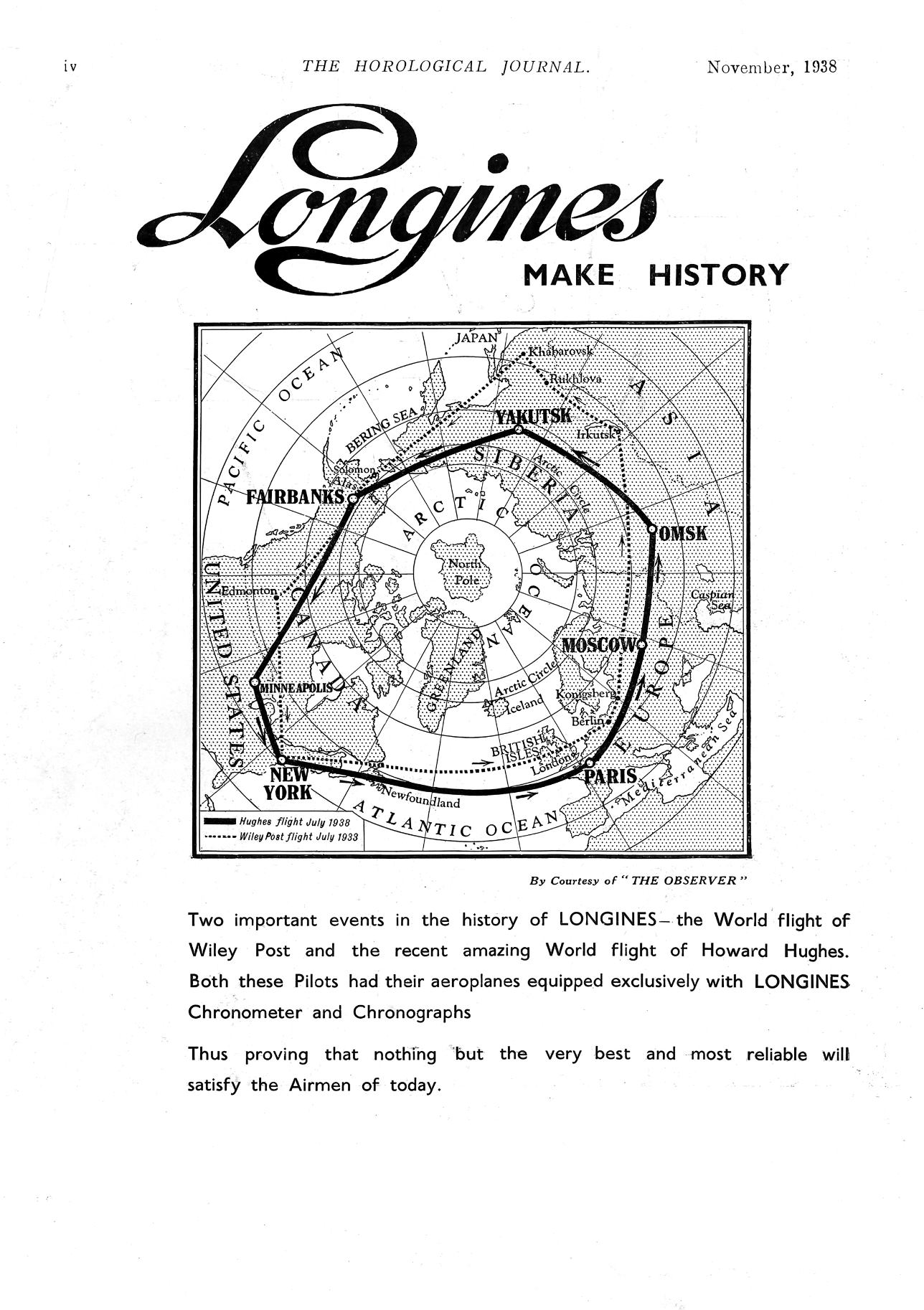 Longines cronometró el vuelo de Hughes alrededor del mundo en 1938. El aviador, empresario, cineasta, utilizó un siderómetro de la firma para calcular la posición. Su tripulación portó relojes para apoyar con la observación. El vuelo tardó 3 días 19 horas y 14 minutos.Haz lo imposible, casi todos me decían que mis ideas eran sólo fantasías. Howard Hugues, piloto, cineasta, emprendedor.