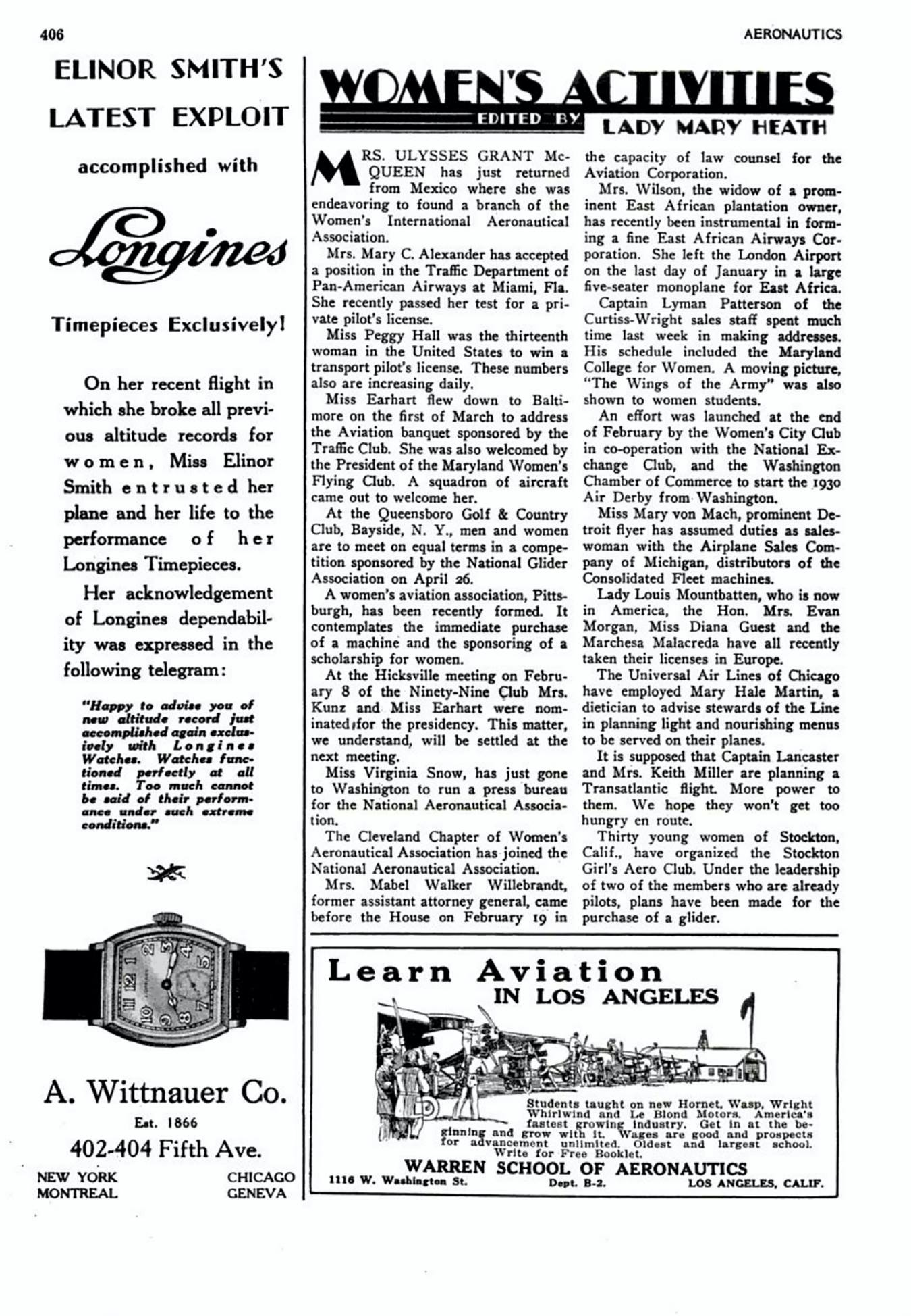 Durante 1931 voló 914 metros, la aviadora estadounidense quien perdió la consciencia. Intentaba batir un récord cuando su avión comenzó a ir en picada. Smith despertó en el último minuto y logró aterrizar con toda seguridad. Diez días después se elevó en lo más alto y estableció 9.929 metros confiando en su reloj Longines. Tras convertirse a los 16 años en la piloto autorizada más joven del mundo, Smith batió a lo largo de su vida varios récords en solitario de resistencia, velocidad, altitud.Hay que dejar que los niños sueñen y tener un horizonte al que mirar. Para mí, sólo existía un camino: con seis años ya sabía que quería volar. Elinor Smith, aviadora.
