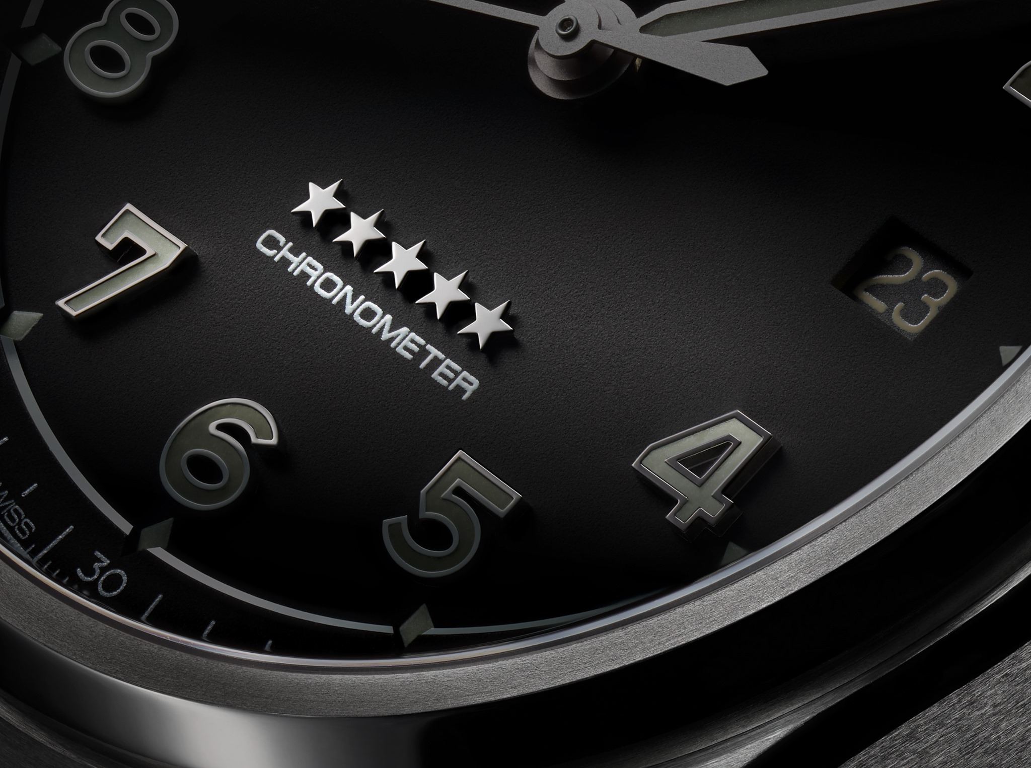 - Carátulas: negra mate, números arábigos aplicados con Super-LumiNova®; plateada graneada con números arábigos aplicados y Super-LumiNova®. Agujas bañadas en rodio o negras enarenadas // azul con efecto rayos de sol, números arábigos aplicados con Super-LumiNova