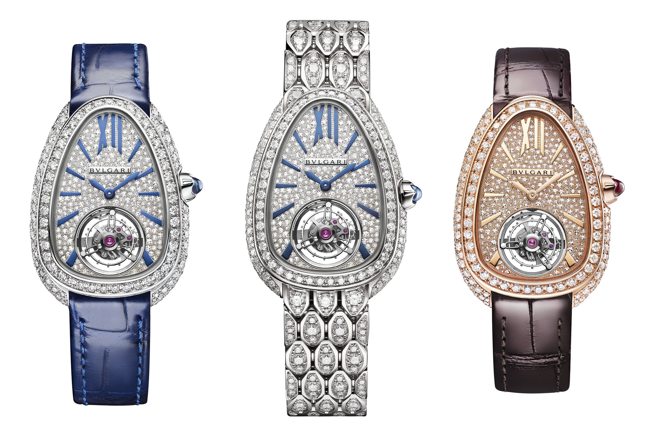 Echa mano del propulsor con torbellino más pequeño del planeta: calibre BVL150, con 40 horas de reserva de marcha a 3 Hz y de remonte manual. Lo presenta en tres referencias: oro blanco y oro rosa con engaste de diamantes y correa de piel de cocodrilo. Pero además una versión con brazalete a juego (oro blanco) y pavé de diamantes.
