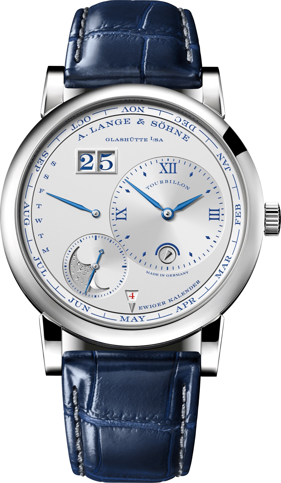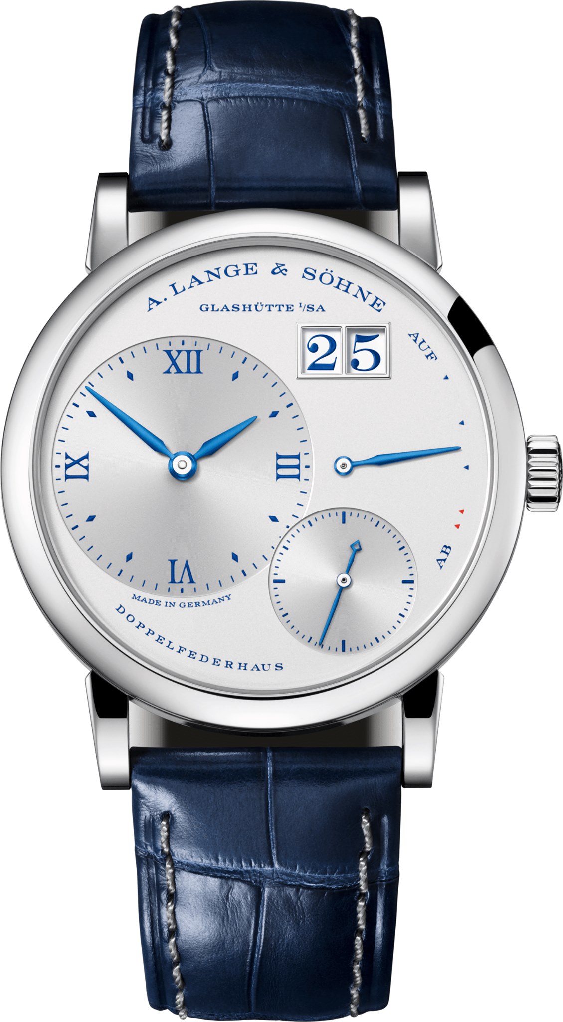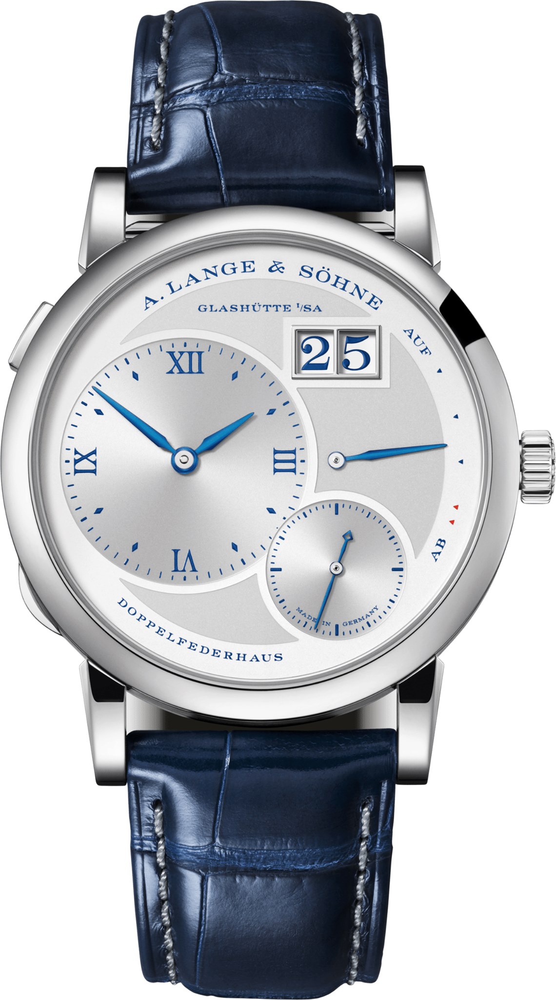 Desarrollado en caja de oro blanco, la referencia se distingue gracias al uso de una carátula plateada cóncava con numerales azules impresos, agujas tipo espada a juego y el diseño clásico e icónico del dial. Luce una tapa abisagrada grabada en oro blanco macizo, la cual está realzada por la fecha de inauguración –1873– de la sede de Lange, los nombres de Walter Lange y Günter Blümlein, además de la leyenda “25 Jahre Lange 1” en relieve. Se abraza al pulso mediante una correa de piel de cocodrilo color azul con hebilla sencilla hecha en oro blanco.
