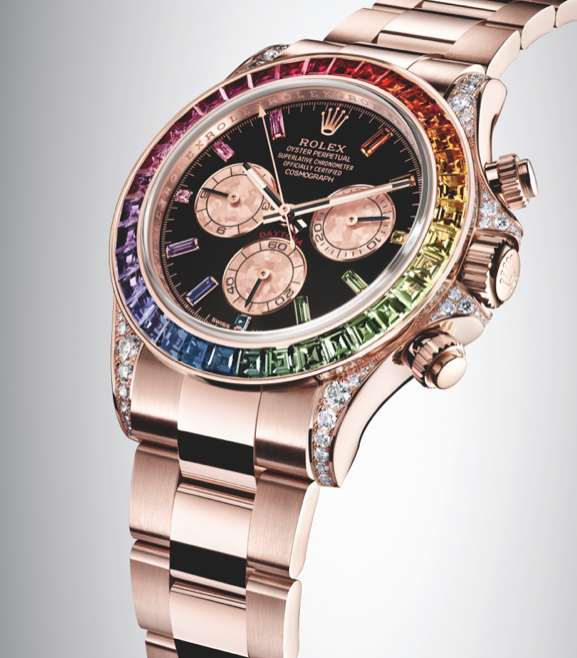 Este modelo, creado en 1963, fue diseñado para cumplir todas las necesidades de los pilotos profesionales con un cronógrafo sumamente confiable y un bisel con escala taquimétrica que permite medir velocidades de hasta 400 kilómetros. El nuevo Oyster Perpetual Cosmograph Daytona, de oro Everose de 18 quilates, está engalanado con piedras preciosas. La emblemática escala taquimétrica del bisel se sustituye por un degradado de 36 zafiros talla baguette con los colores del arcoíris. Los índices se materializan sobre la carátula mediante 11 zafiros talla baguette, cada uno de ellos de la misma tonalidad que la gema situada frente a frente en el bisel. Comparten la esfera con los tradicionales contadores de cronógrafo, realizados en Gold Crystals rosa. La caja está, por su parte, adornada por 56 diamantes talla brillante engastados en las asas y los protectores de la corona. Esta nueva versión está equipada con el calibre 4130, que cuenta con una espiral Parachrom azul fabricada por Rolex en una aleación paramagnética exclusiva y ofrece unas 72 horas de reserva de marcha aproximadamente. Rolex es el actual Reloj Oficial y Cronometrador de la Fórmula 1.