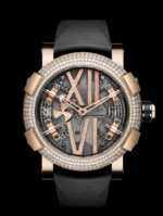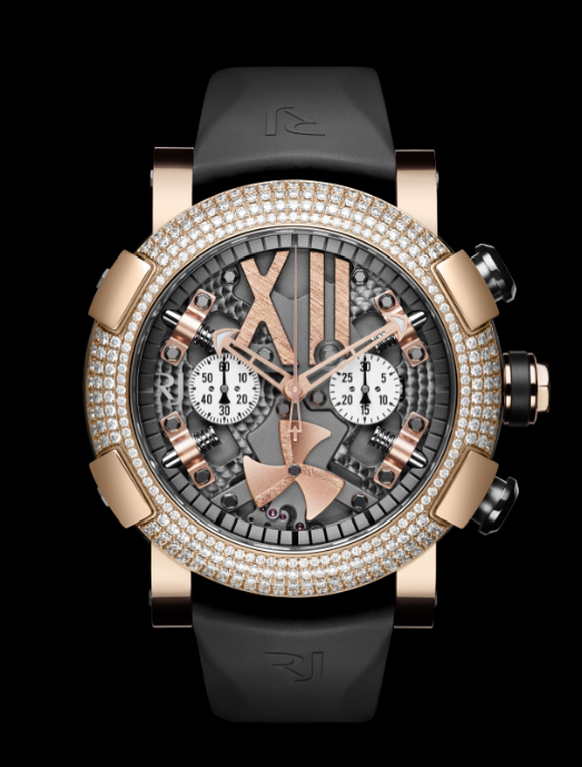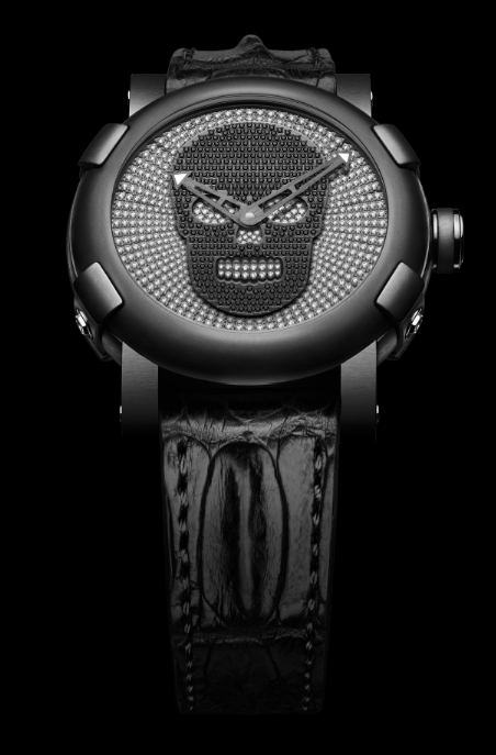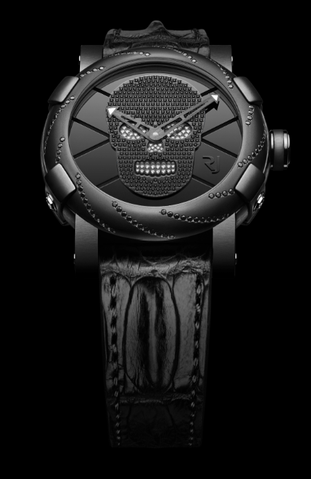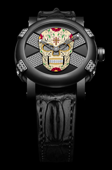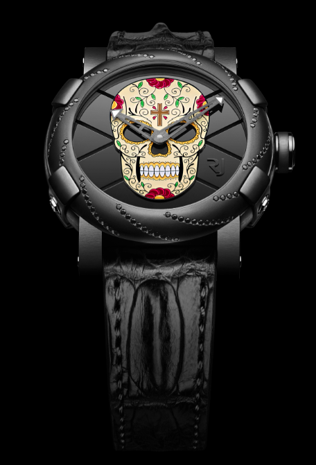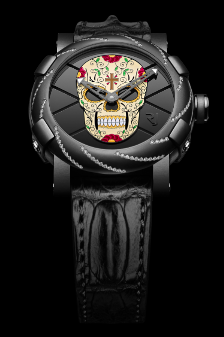 Finalmente, el reloj creado a propósito de la celebración del Día de los Muertos de México, ofrece una nueva interpretación ahora con cinco versiones con joyas incrustadas. Se ajustó el bisel para que luzca el adorno de la calavera en la carátula. En estos modelos disponibles con diamantes o zafiros negros, se han utilizado 108 piedras para crear el patrón. Otras tres versiones: una con el cráneo engastado con 374 espinelas negras por un total de alrededor de 0.62 quilates, y el otro con una carátula engastada completamente con diamantes pavé (469 piedras por un total de alrededor de 0.57 quilates), y el último, en el que las icónicas garras de la marca y la cruz se establecen con 232 diamantes (aproximadamente 0.54 quilates). Al mejorar el bisel e incluir la piedras preciosas RJ-Romain Jerome acentúa aún más el contraste entre el lado oscuro del modelo que evoca la muerte en acero negro recubierto en PVD y el carácter festivo y alegre del Día de los Muertos, que se celebra en México.