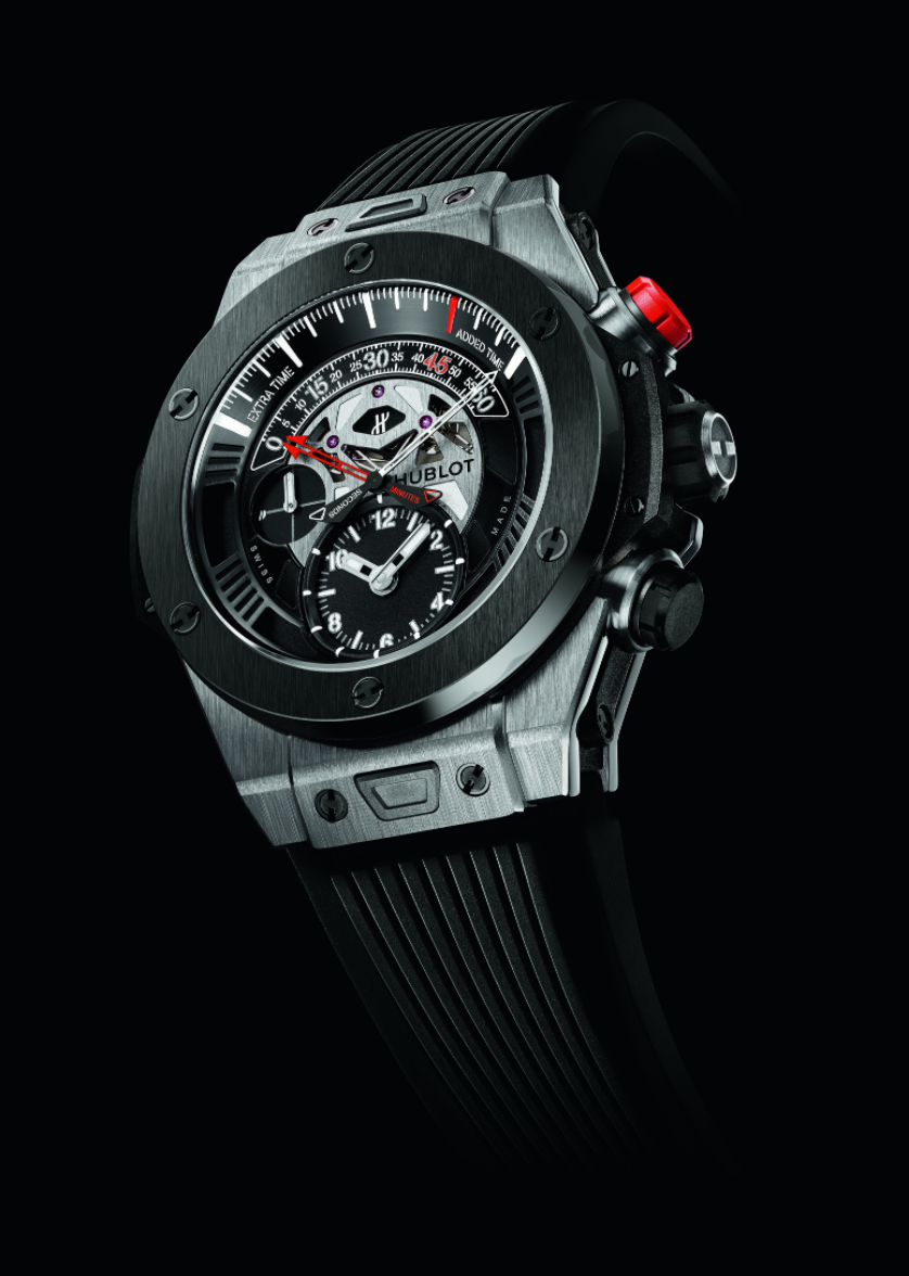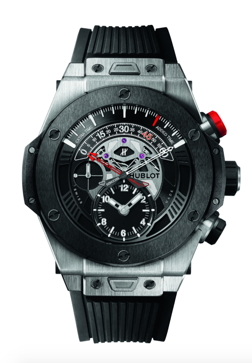 El diseño y la esencia única de HUBLOT, una vez más se ve reflejada en su nueva creación. Un módulo bi-retrógado desarrollado por la marca y construido por una fuente de energía adicional, es el principal elemento que da la diferencia sobre las piezas anteriores. Además, el Big Bang Unico Retrograde Chronograph está creado para medir los tiempos exactos de los partidos más un tiempo extra de hasta 60 minutos. El cronógrafo ubicado en la parte central del reloj, cuenta con los contadores de minutos y segundos que se mueven de manera circular entre las 10 y 2 en punto. En la ventanilla del centro, se indica el tiempo del partido, mientras que el tiempo real se lee en el contabilizador ubicado a las 6 pm.