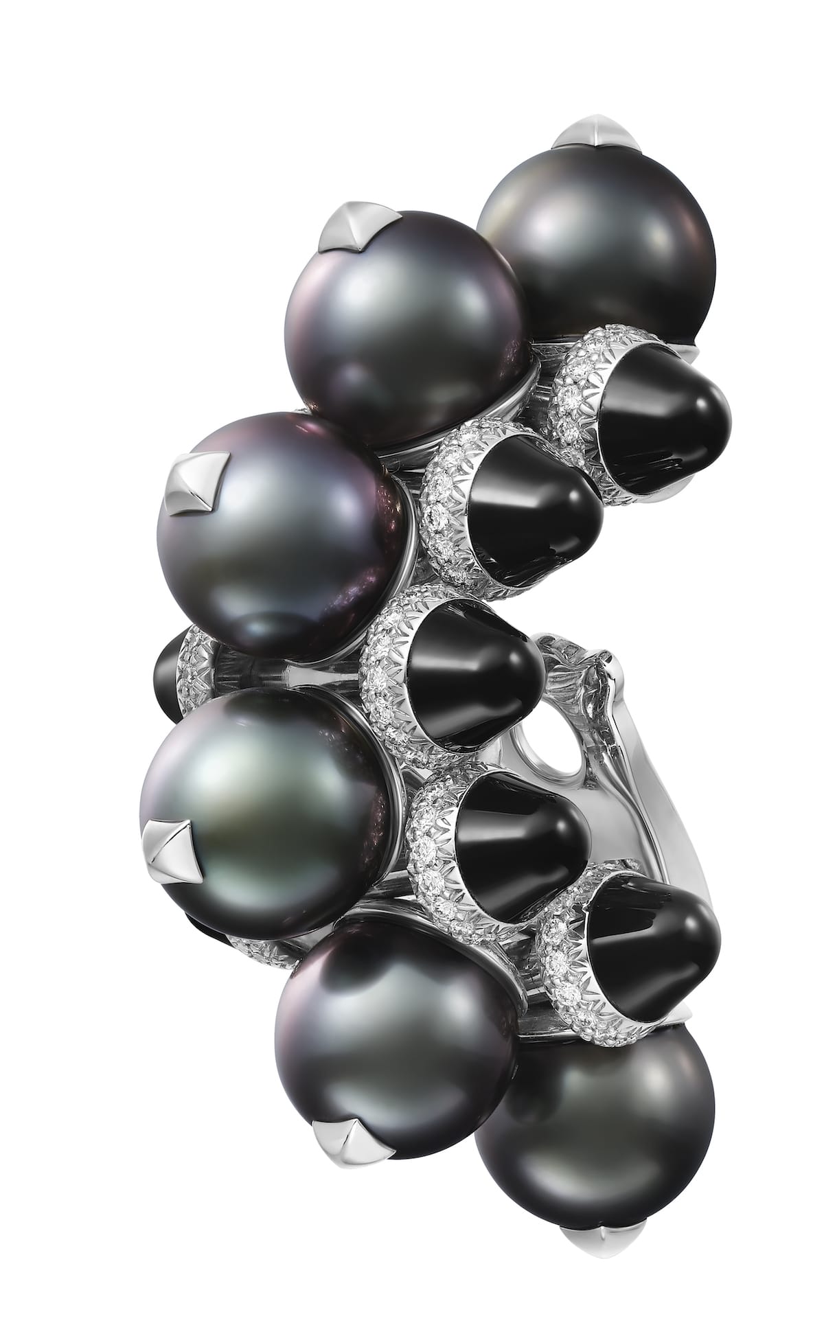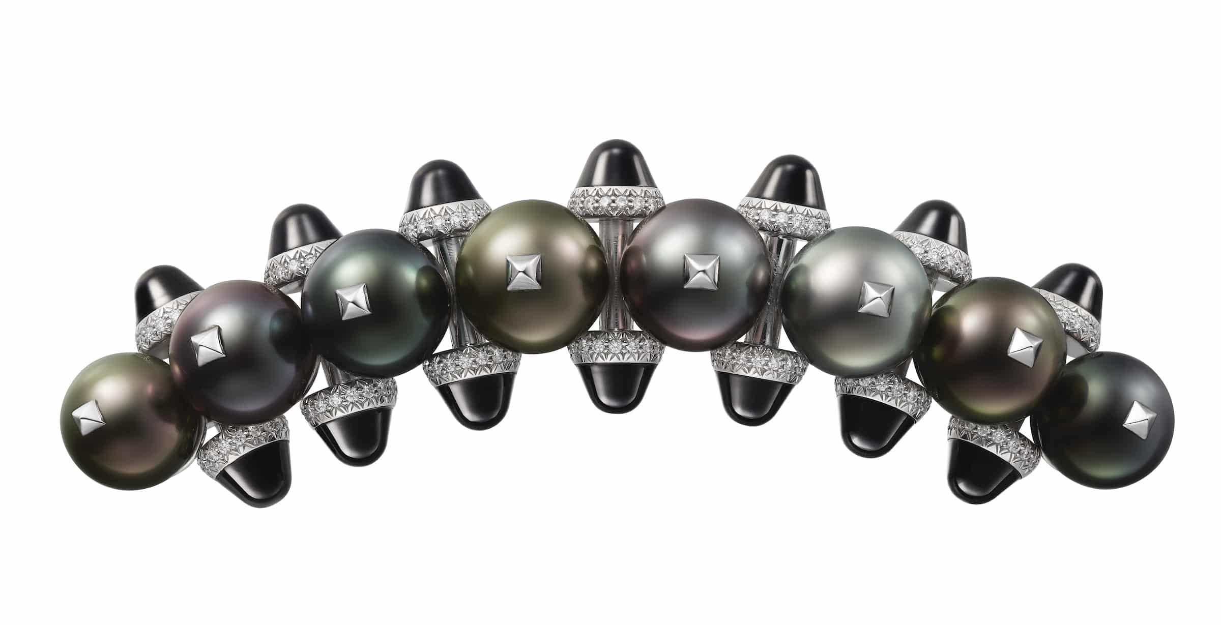 De esta manera, encontramos en la colección: anillo, pulsera, pendiente y broche en oro blanco, perlas de Tahití, ónix y diamantes; así como anillo, pulsera, collar y pendientes de aro en oro rosa y ónix.