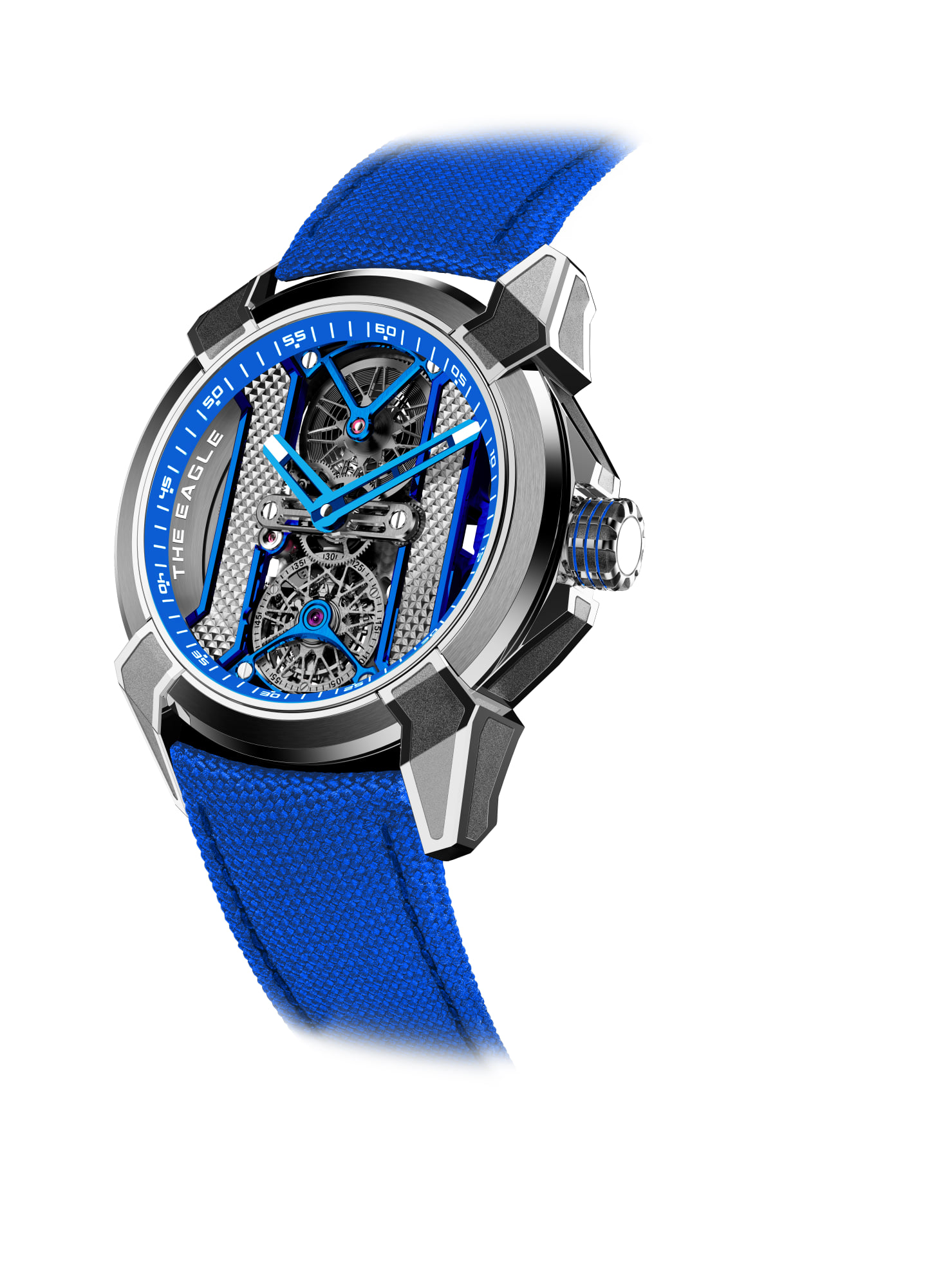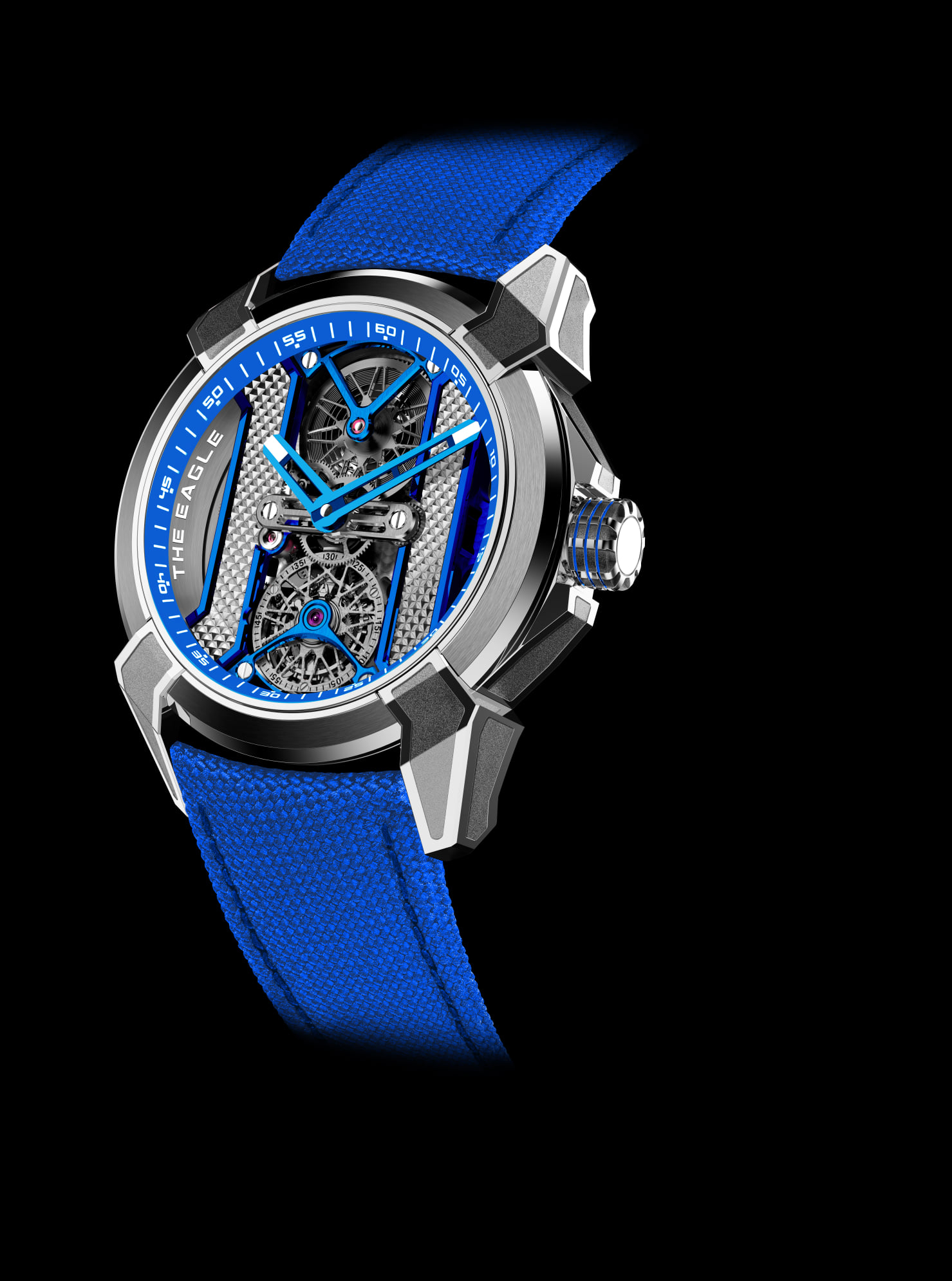 Está propulsado por un movimiento tourbillon esqueletizado de Alta Relojería, finamente acabado. Ésta increíble edición limitada presenta hermosas decoraciones azules, con “The Eagle” grabado en el bisel interior. El tourbillon esqueletado elimina la mayor cantidad de material posible, haciéndolo casi transparente. La caja Epic X de 44 mm muestra esta fascinante complicación con sus engranajes, ruedas y puentes expuestos.