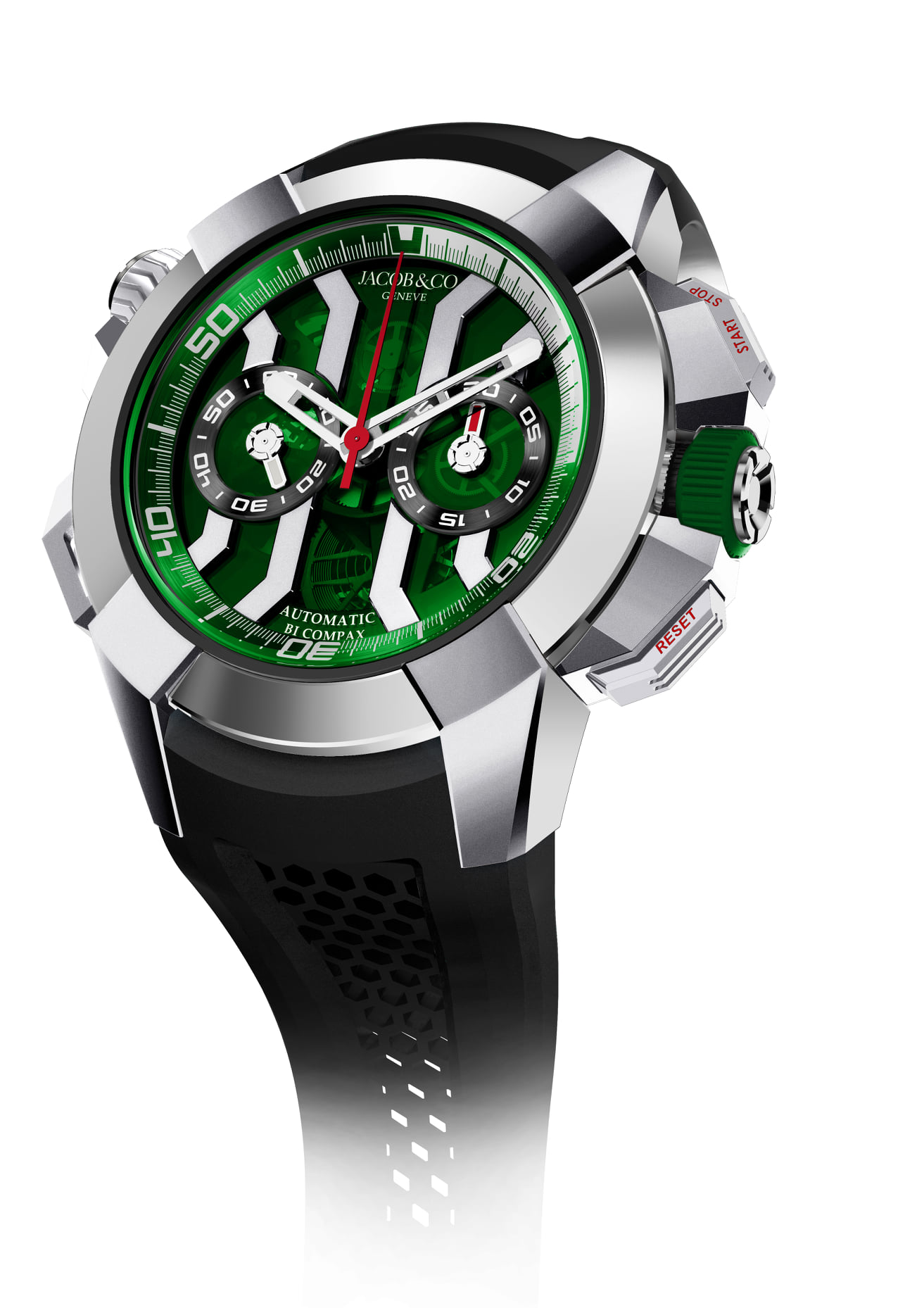 Epic X Chrono Khabib: el reloj más deportivo de Jacob & Co. y de 47 mm presenta un movimiento de cronógrafo de rueda de pilares parcialmente esqueletado. Resaltado con toques verdes, el reloj presenta una esfera de cristal mineral verde, coronas de goma roja, un bisel giratorio interno, la leyenda “29-0” a las 6 en punto y es resistente al agua hasta 200 metros.