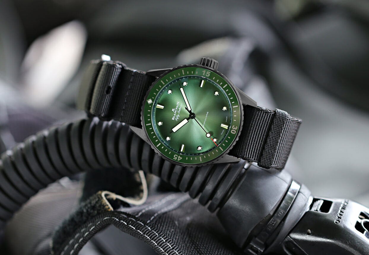Se presenta en versión 3 agujas del modelo Bathyscaphe, introduce un nuevo color en la colección de relojes Fifty Fathoms. La carátula verde tropical de esta pieza capta la luz y revela sus reflejos cromáticos gracias a un acabado soleado. Este tono fresco hace resaltar los elementos estéticos icónicos del Bathyscaphe, como sus agujas tipo bastón y sus índices geométricos cubiertos de material luminiscente. El bisel giratorio unidireccional contiene un inserto de cerámica verde que hace juego con el dial, elaborado en cerámica negra satinada, la caja de 43.6 mm de diámetro es estanca hasta los 300 metros y el fondo de cristal de zafiro permite admirar el calibre 1318, una variante sin fecha del 1315.