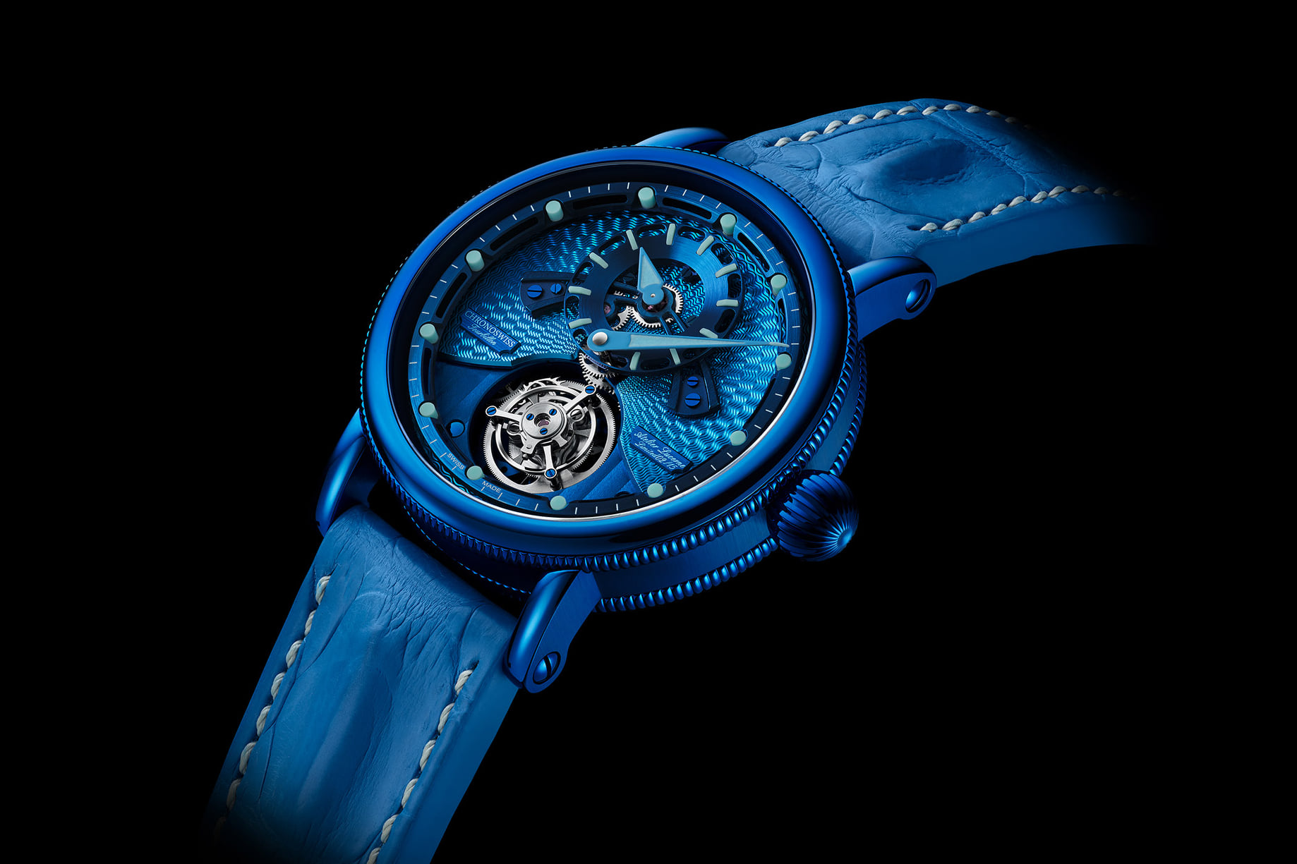 Tourbillon volante, repetición de minutos, calibre mecánico automático. Esto sustenta el nombre italiano tan sexy que le han puesto a la pieza. Fabricada en caja de 45 mm, no está hecha de acero, oro o platino, sino de un material patentado llamado CarTech Micro-Melt BioDur CCMTM, un metal producto de polvo que se sintetiza para lograr un estado sólido que termina siendo más duro que el acero, resistente al desgaste y permanentemente brillante. El calibre luce un trabajo de esqueletización entrecruzado asombroso, visible a través de una especie de carátula calada o flotante en tonos azul cepillado, con índices recubiertos en tratamiento luminiscente.
