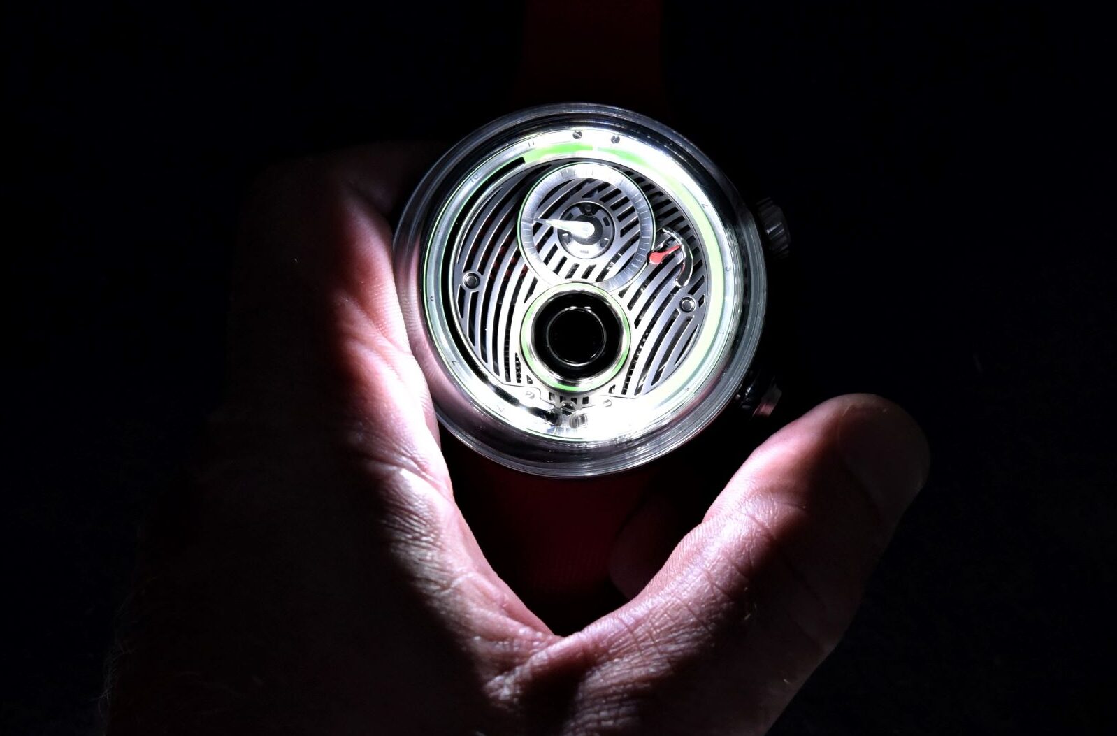 El nuevo modelo se presenta en una caja asimétrica de acero de 51 mm dotada de dos coronas: la de las 2 en punto sirve para ajustar la hora y dar cuerda al movimiento mecánico. La corona de las 4 en punto se utiliza para iluminar el reloj. Activado mediante un pulsador, un micro-generador de energía almacena y disipa la corriente para activar los led. Lo interesante es que no utiliza una batería, sino que transforma la energía mecánica almacenada en un barrilete destinado en energía eléctrica. Ocho o trece según la versión, estos diodos dispersan la luz perceptible de forma homogénea por toda la carátula para así evocar una ola natural.