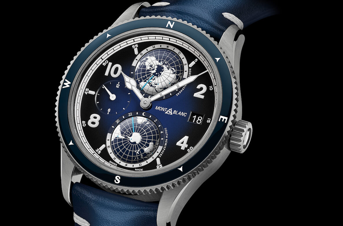 Si bien el reloj fue presentado en 2018 y ha evolucionado desde entonces: caja de bronce o acero con estética negro y beige en 2018; caja de bronce o acero con estética verde en 2019. Hoy luce una estructura de titanio y semblante azul, muy ad hoc con el color del año en la relojería, pero más allá, con las aventuras alpinas, gélidas, de la exploración. Cuenta con el calibre de MB 29.25, que posibilita la vista de la hora mundial con dos globos giratorios de hemisferio en forma de cúpula que realizan una rotación completa en 24 horas. El hemisferio norte a las 12 h gira en sentido contrario a las manecillas del reloj, mientras que el hemisferio sur gira en el sentido de las manecillas del reloj. Ambos están rodeados por una escala con las 24 zonas horarias, junto con una indicación de día/noche en colores contrastantes. Con esta nueva indicación de hora mundial de dos hemisferios, el Montblanc 1858 Geosphere trae una nueva manera instintiva de apreciar las diferentes zonas horarias.