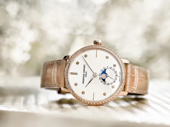 Frédérique Constant decidió rendir un homenaje a la Luna hace apenas un par de años con su calibre de manufactura de construcción delgada (FC-705), y este año ha utilizado el mismo motor (FC-703 *ligeramente modificado) para situarlo en una caja de 38 mm de diámetro, engastada con 60 diamantes entre bisel e índices. Descubre tu pasión por la Luna gracias al nuevo Slimeline Manufacture de Frédérique Constant, animado por un confiable calibre in-house y embellecido por los diamantes.