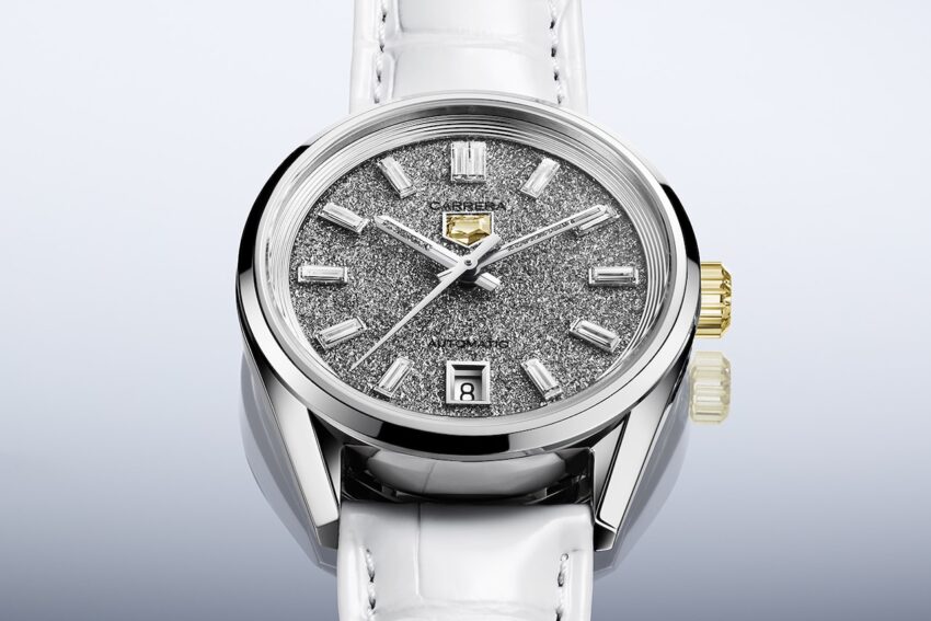 Por si fuera poco, la esfera tiene 12 índices de oro blanco engastados con diamantes blancos talla baguette de 0.5 quilates cultivados en laboratorio. Las agujas de horas y minutos son esqueletadas. A las 12 horas hay otro diamante amarillo cultivado en laboratorio en forma del escudo de TAG Heuer. El reloj se complementa con una correa de aligátor blanco y está equipado con el Calibre 7 automático, visible gracias al cristal de zafiro del reverso.
